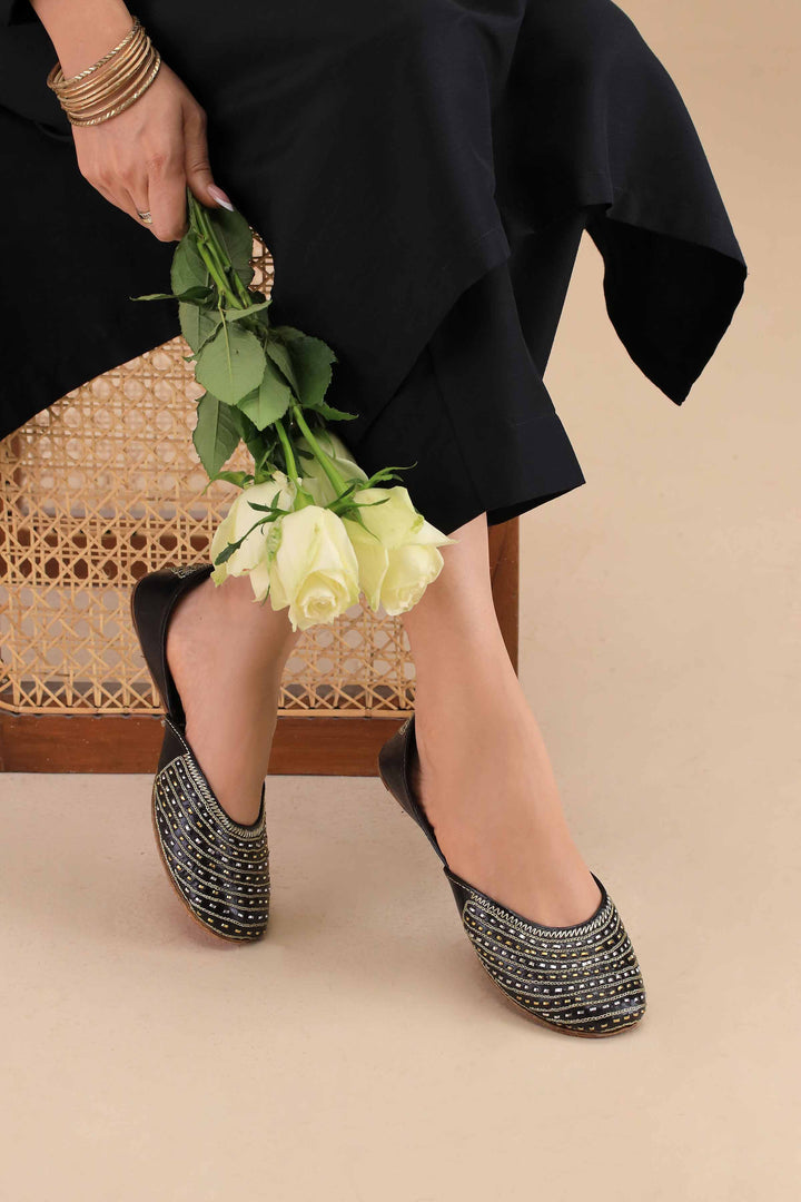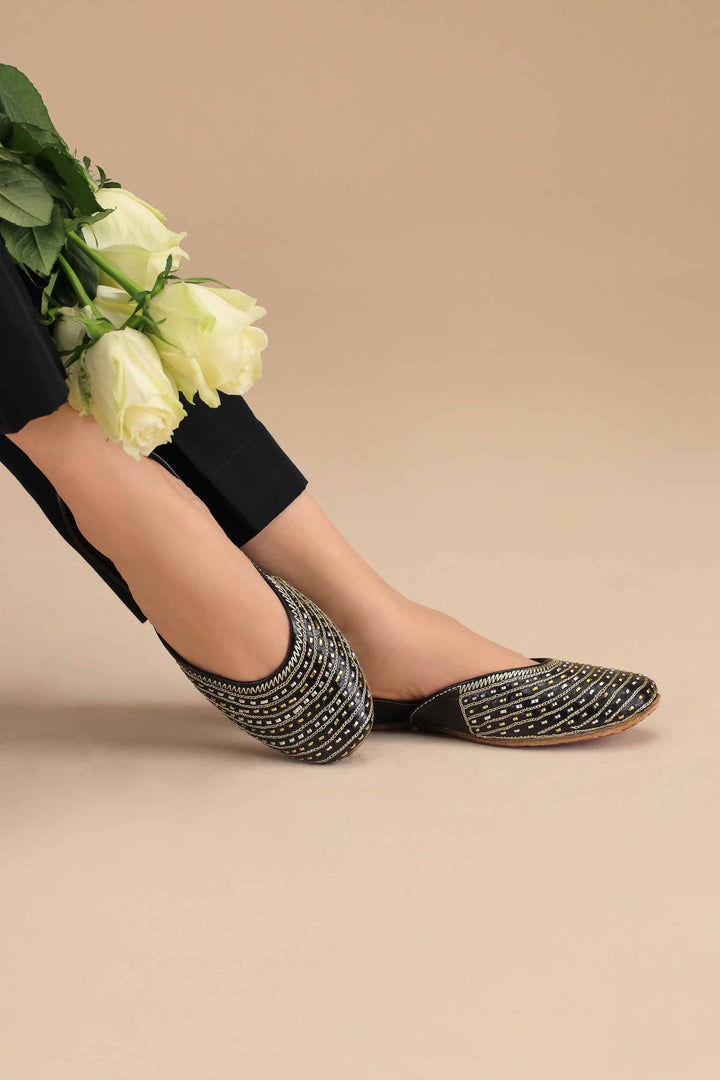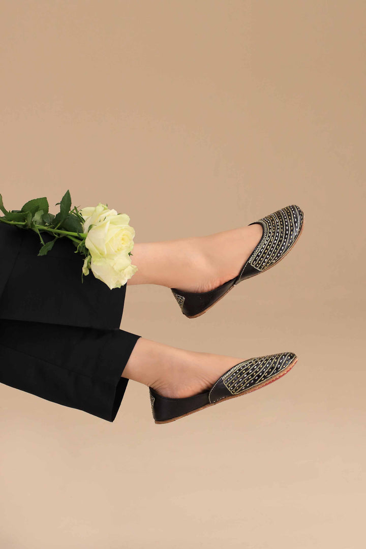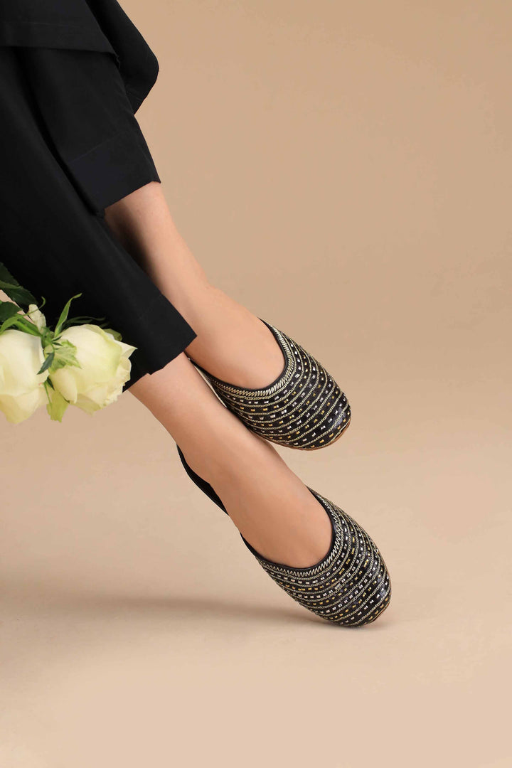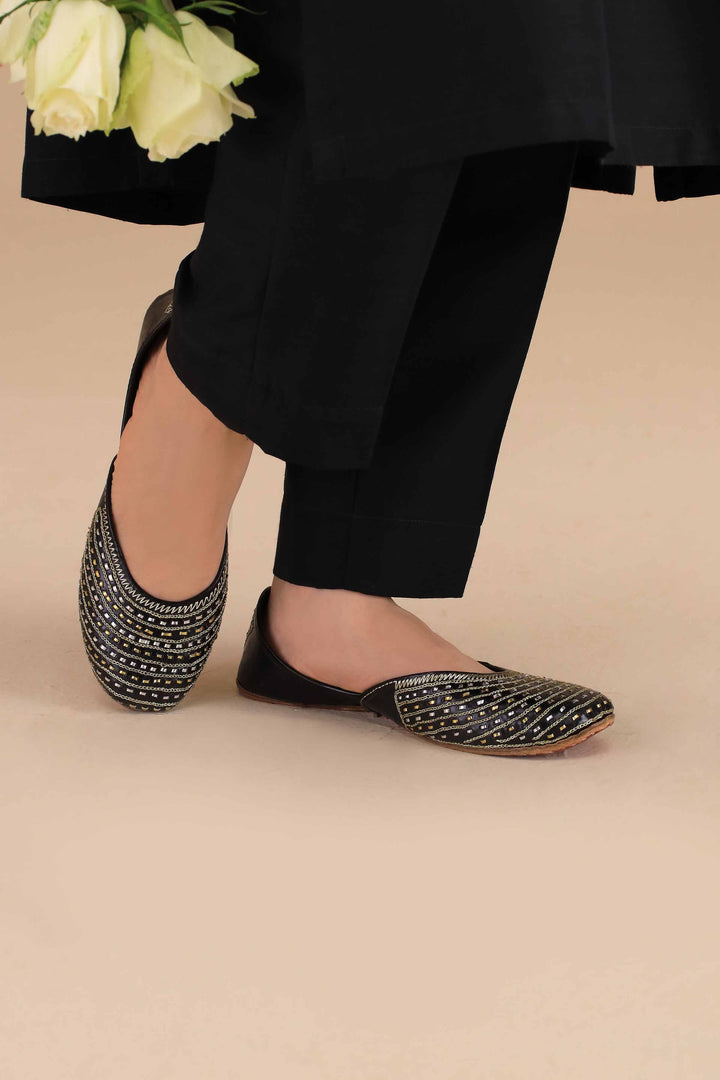 Exquisitely handcrafted Khussa featuring intricate threadwork and metallic detailing, designed for a festive and traditional look. Perfect for weddings, cultural events, and ethnic wear.