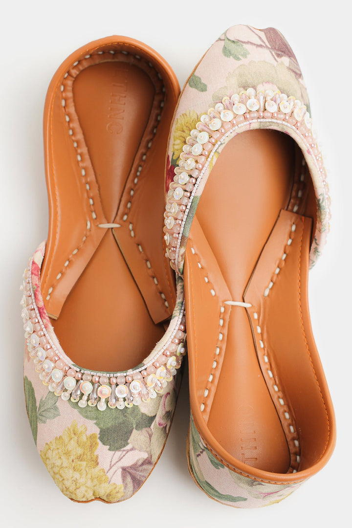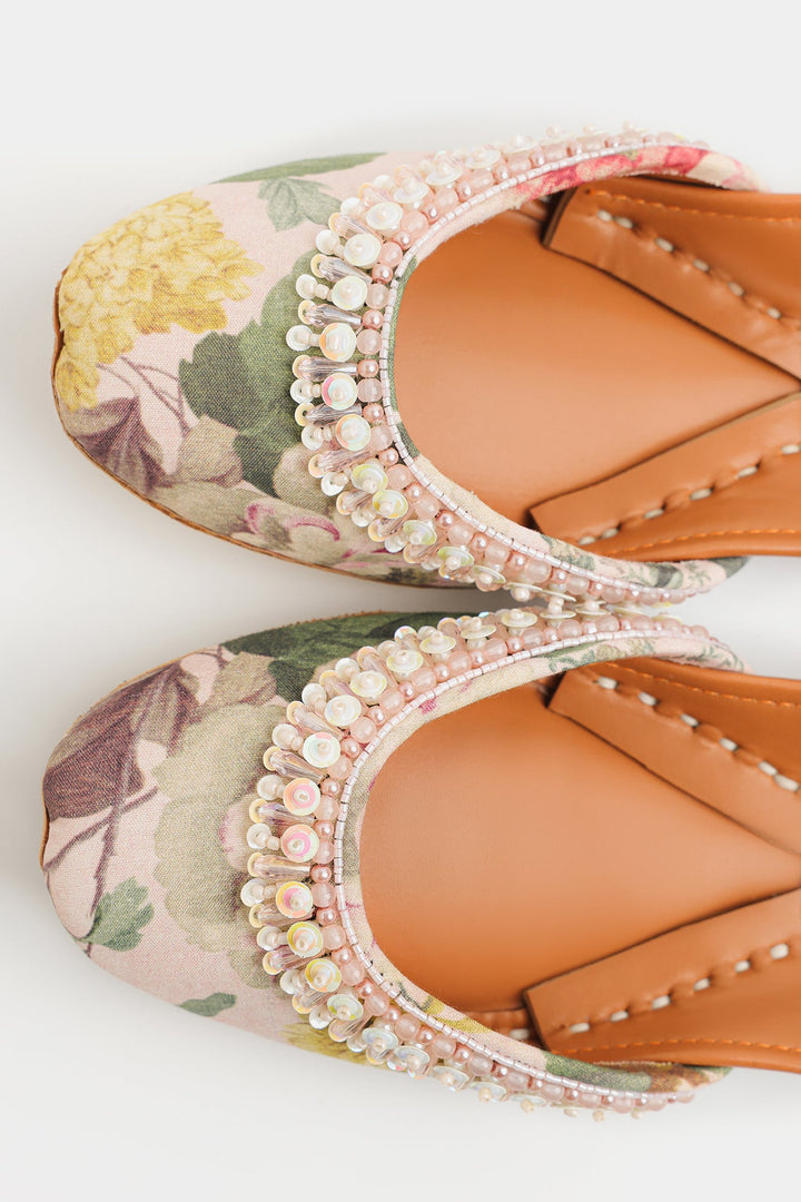 Expertly crafted with a light-pick printed design and adorned with delicate flower patterns and pearls, our khussa adds a touch of elegance to your outfit. Its unique features combine to create a stunning piece that will elevate any look.