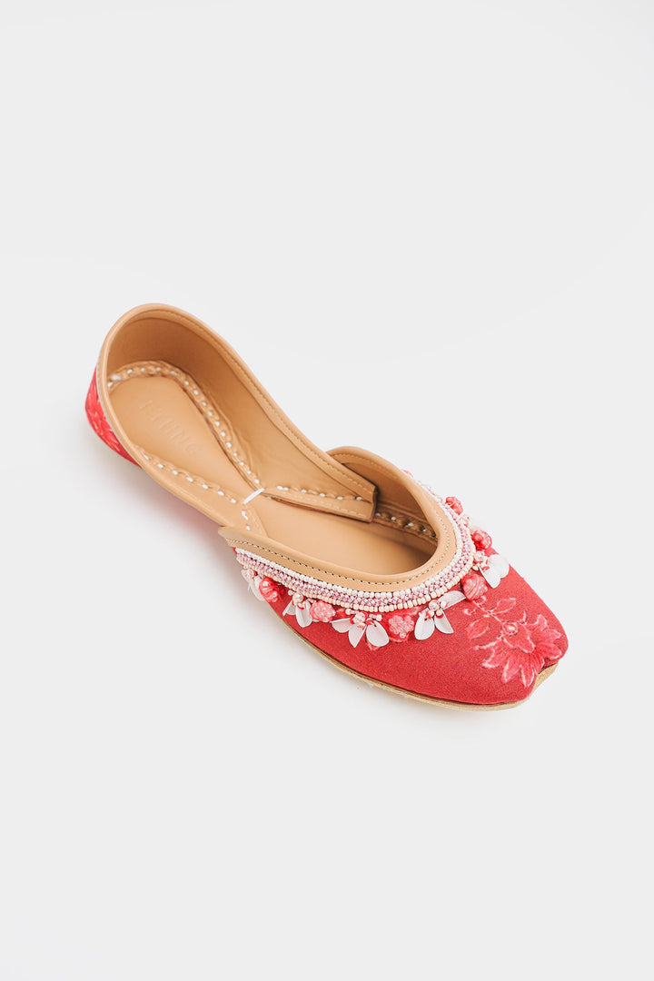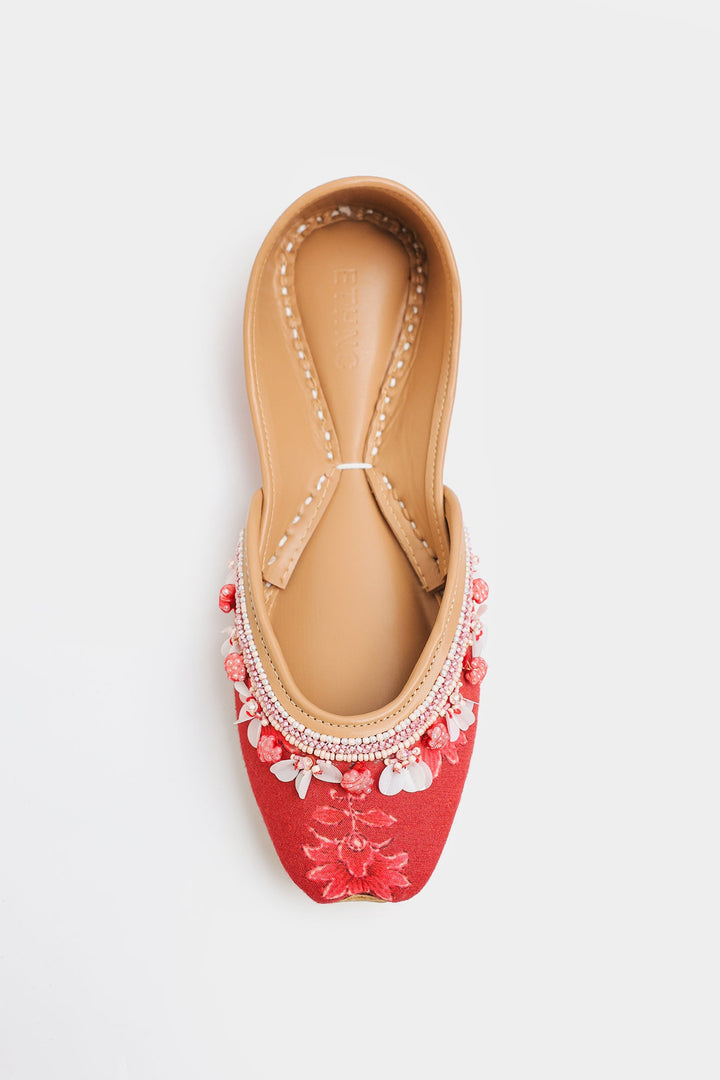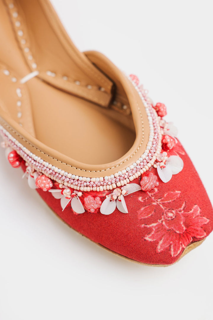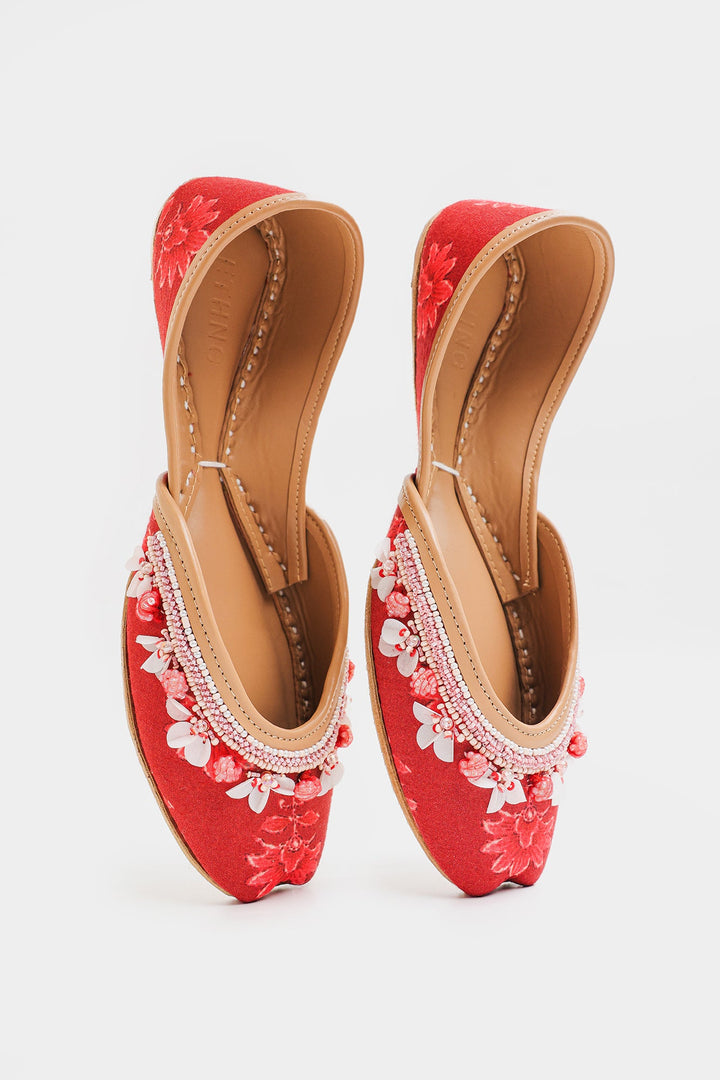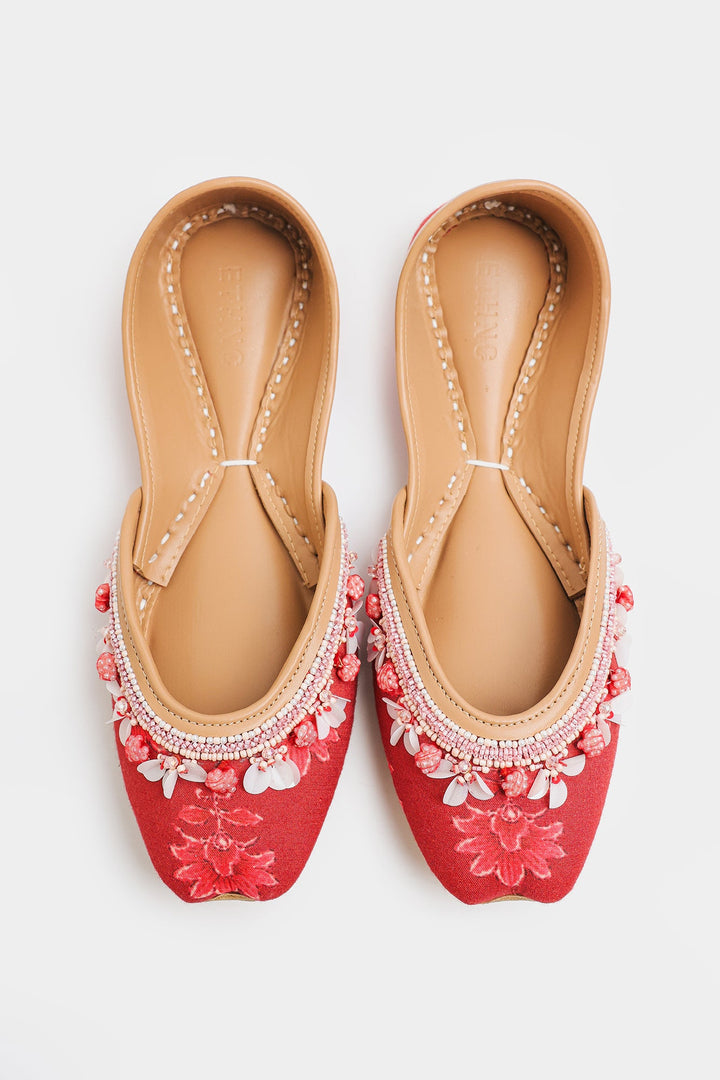 Unveil timeless elegance with these exquisitely crafted khussa, blooming with vibrant floral embroidery and delicate beadwork in rich crimson and soft blush tones. Each step becomes a statement of refined tradition and artisanal charm.