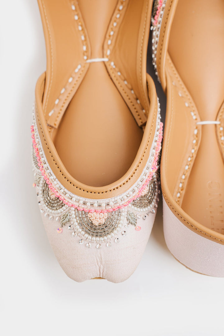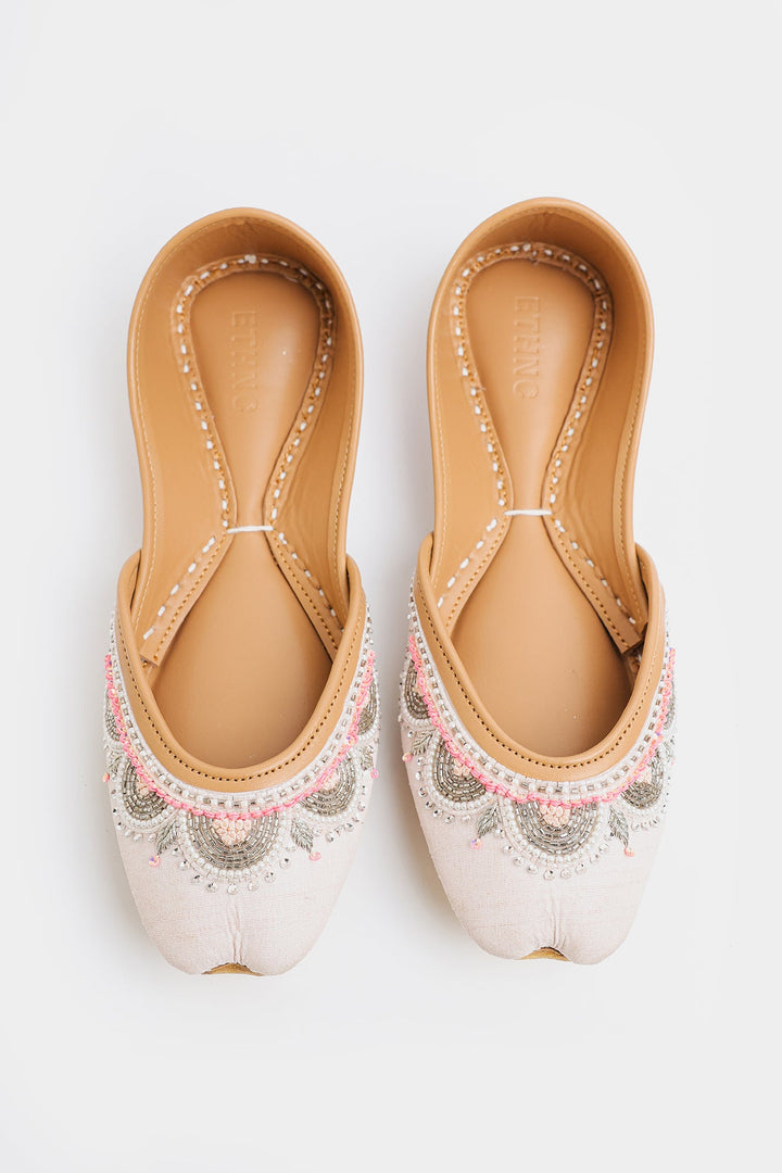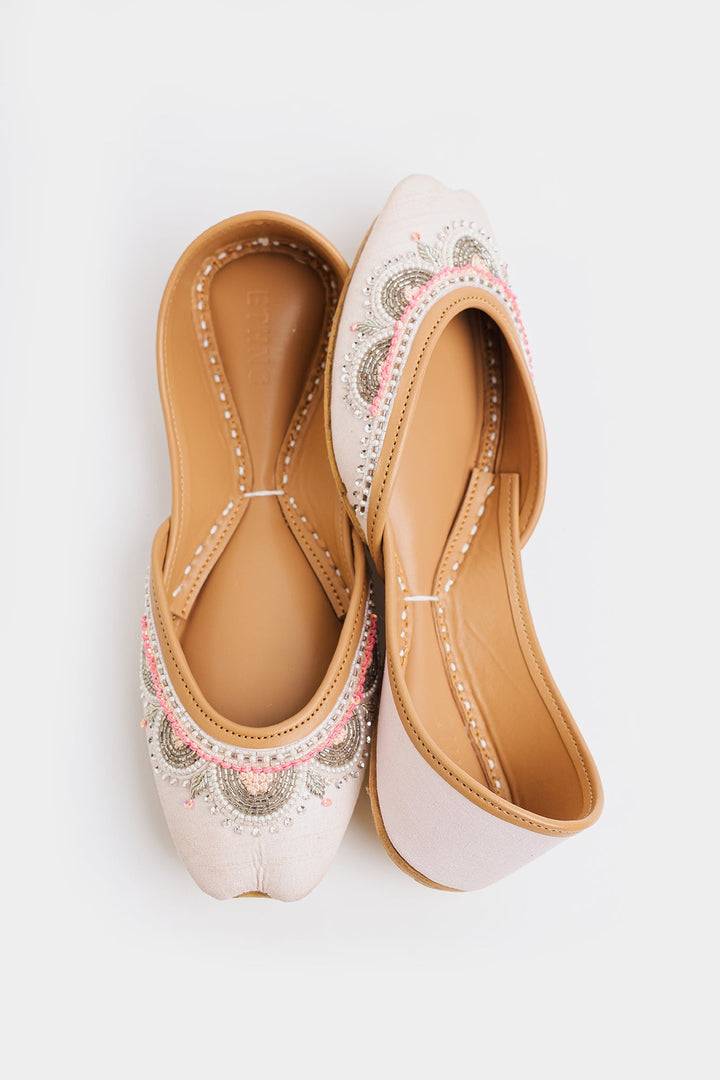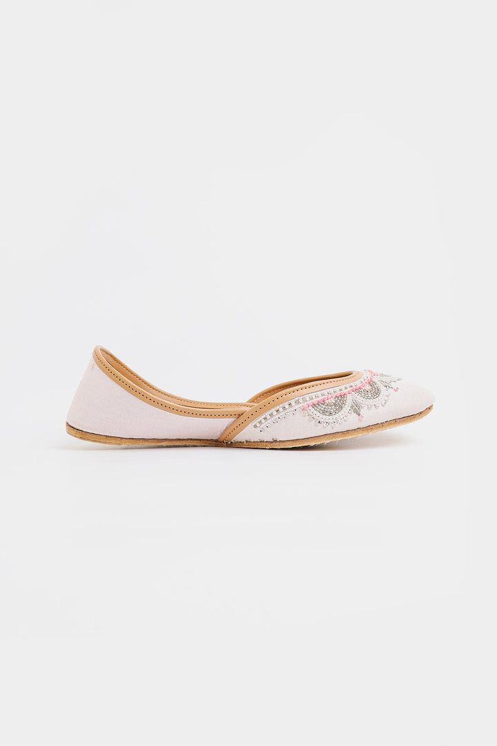 A pink fabric base adorned with delicate beadwork and sequins, creating a shimmering, semi-circle pattern across the upper edges. The embellishments add a festive and elegant touch, making them suitable for special occasions or traditional outfits.