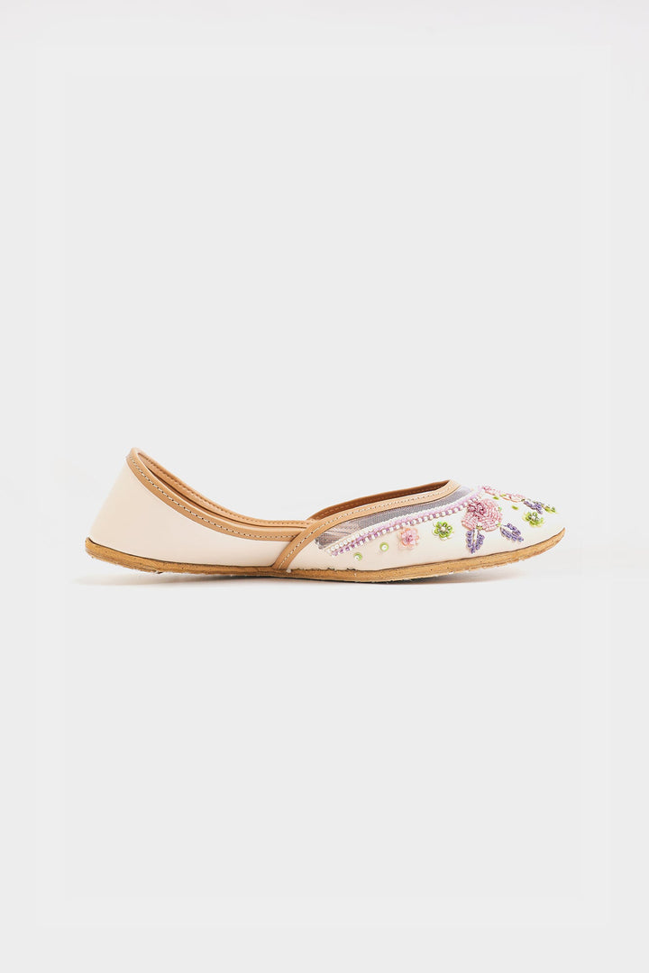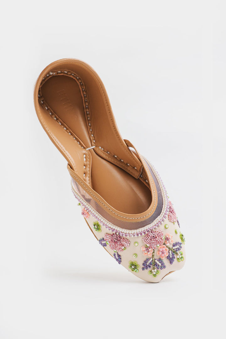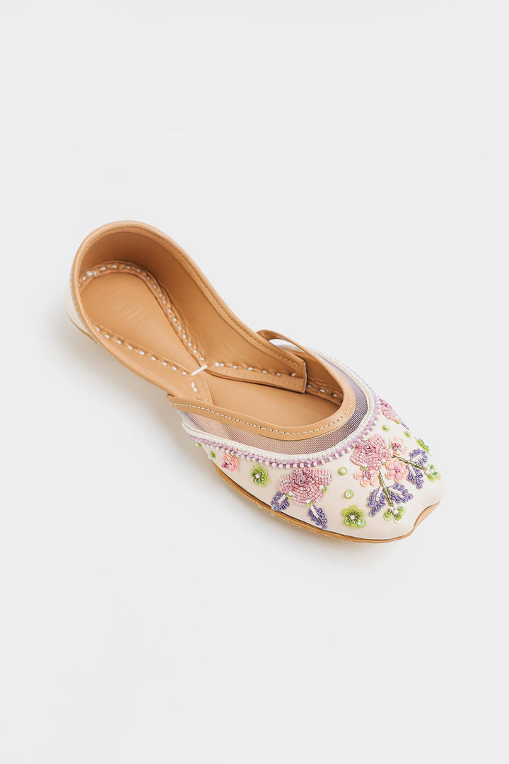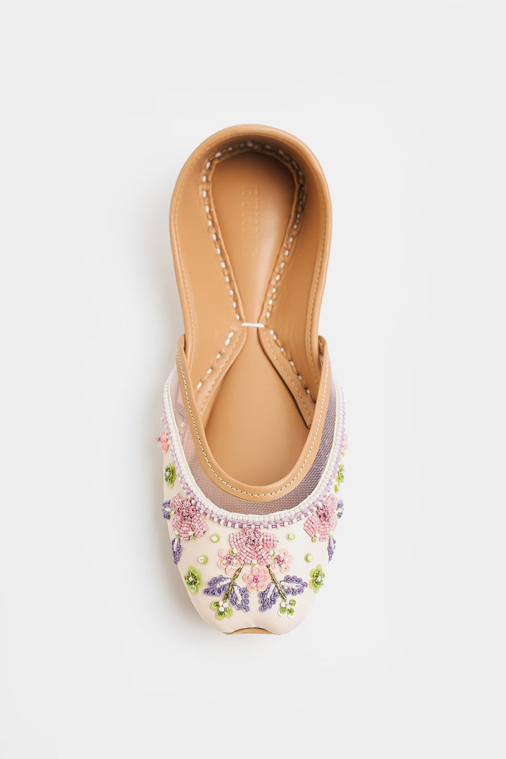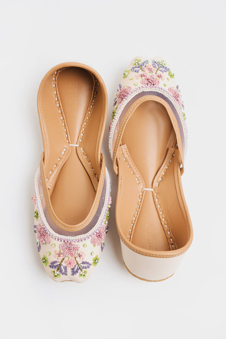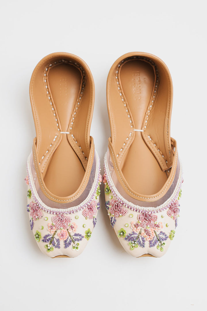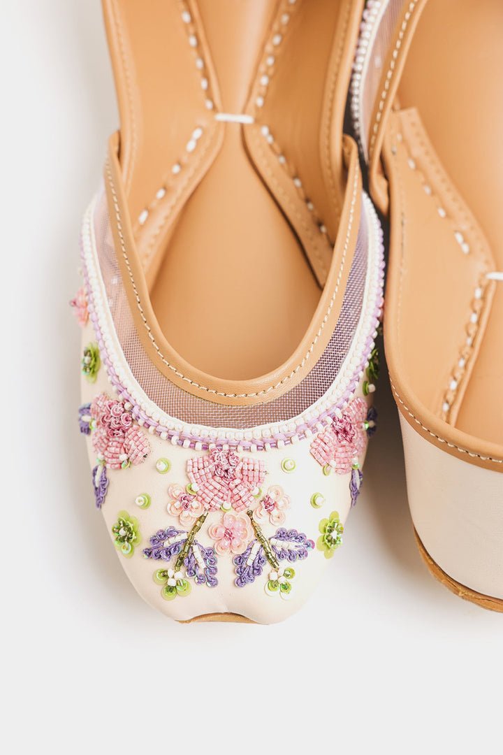 Sophisticated vanilla ice khussa featuring exquisite lavender and pink embroidery, enhanced with precise sequins and beadwork. This Khussa showcases exceptional craftsmanship through its delicate color palette and intricate detailing, offering a refined balance of traditional and contemporary elegance.