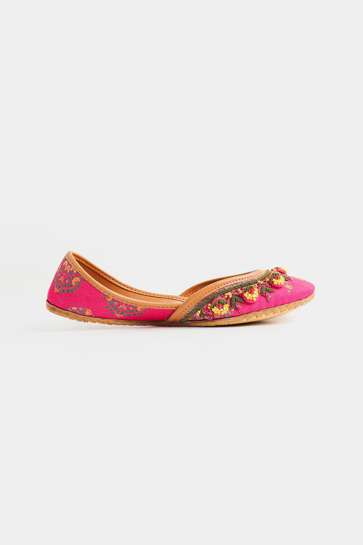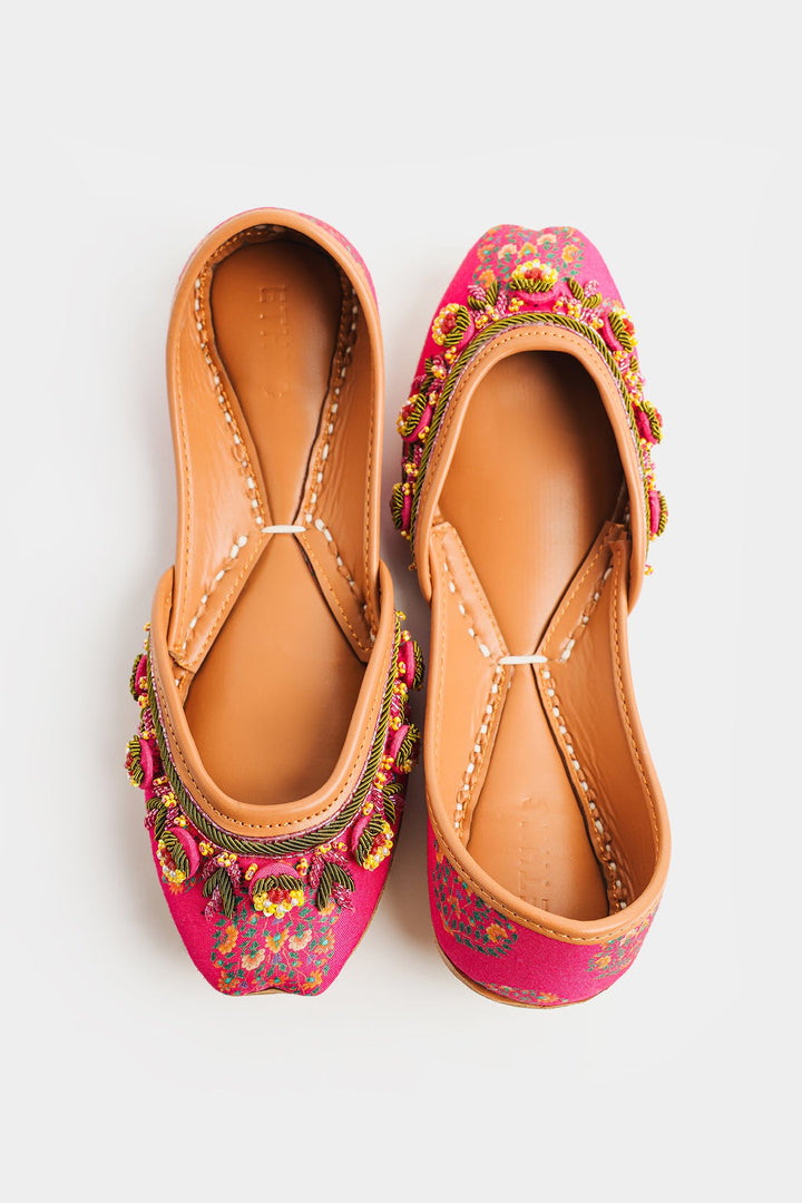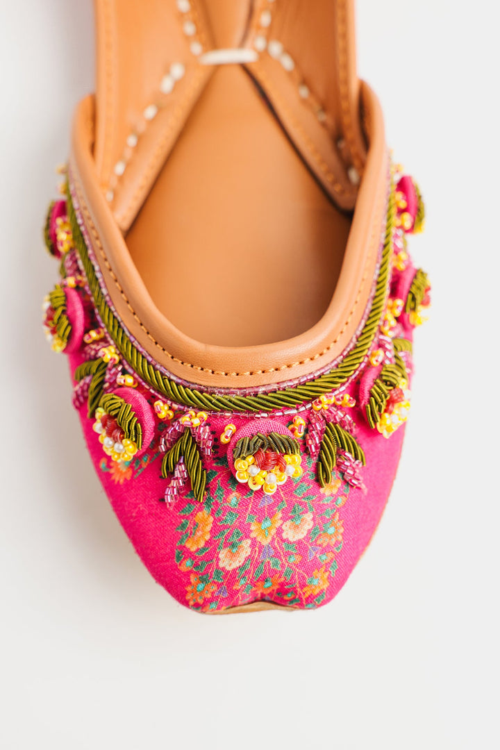 Handcrafted with intricate detail, these Khussas are a celebration of vibrant color and traditional artistry. The rich fuchsia fabric is adorned with delicate floral embroidery in shades of green and yellow. A playful fringe of pink and green beaded tassels adorn the edges, adding a touch of whimsical charm. The classic tan leather sole ensures both comfort and style, making these Khussas perfect for adding a pop of joyful elegance to any outfit.