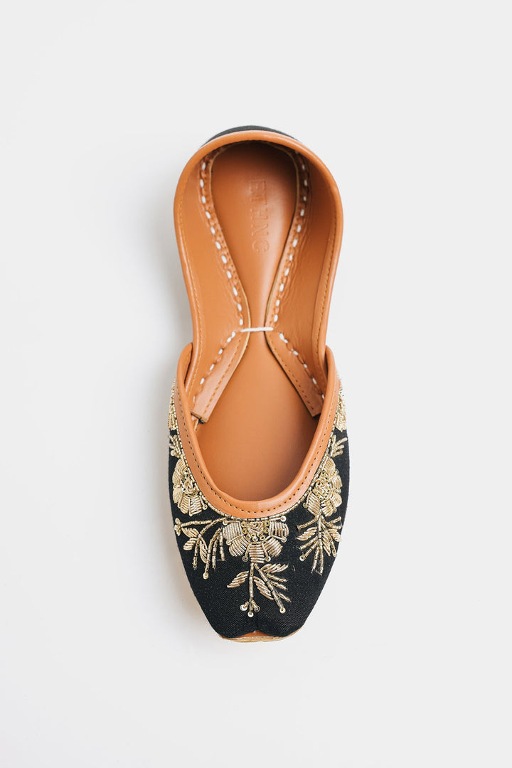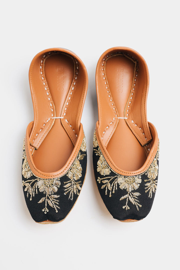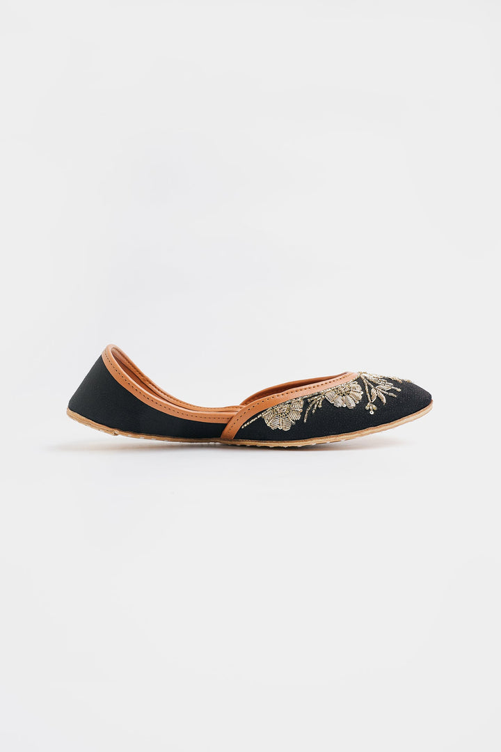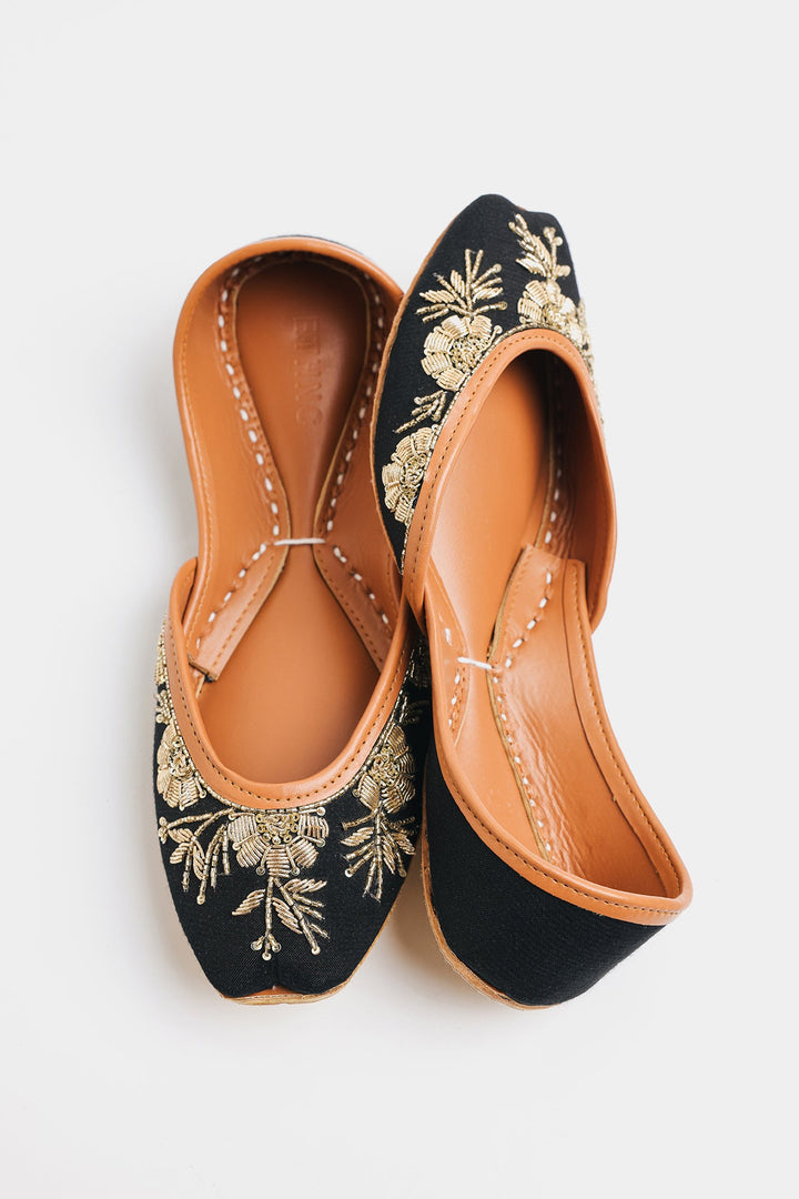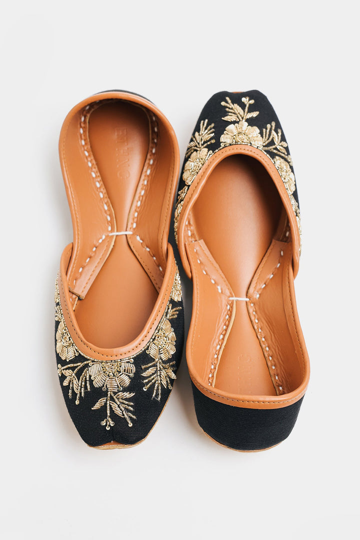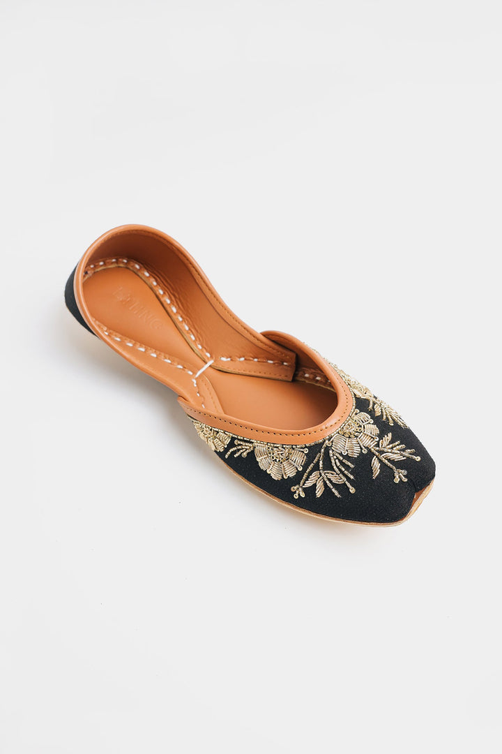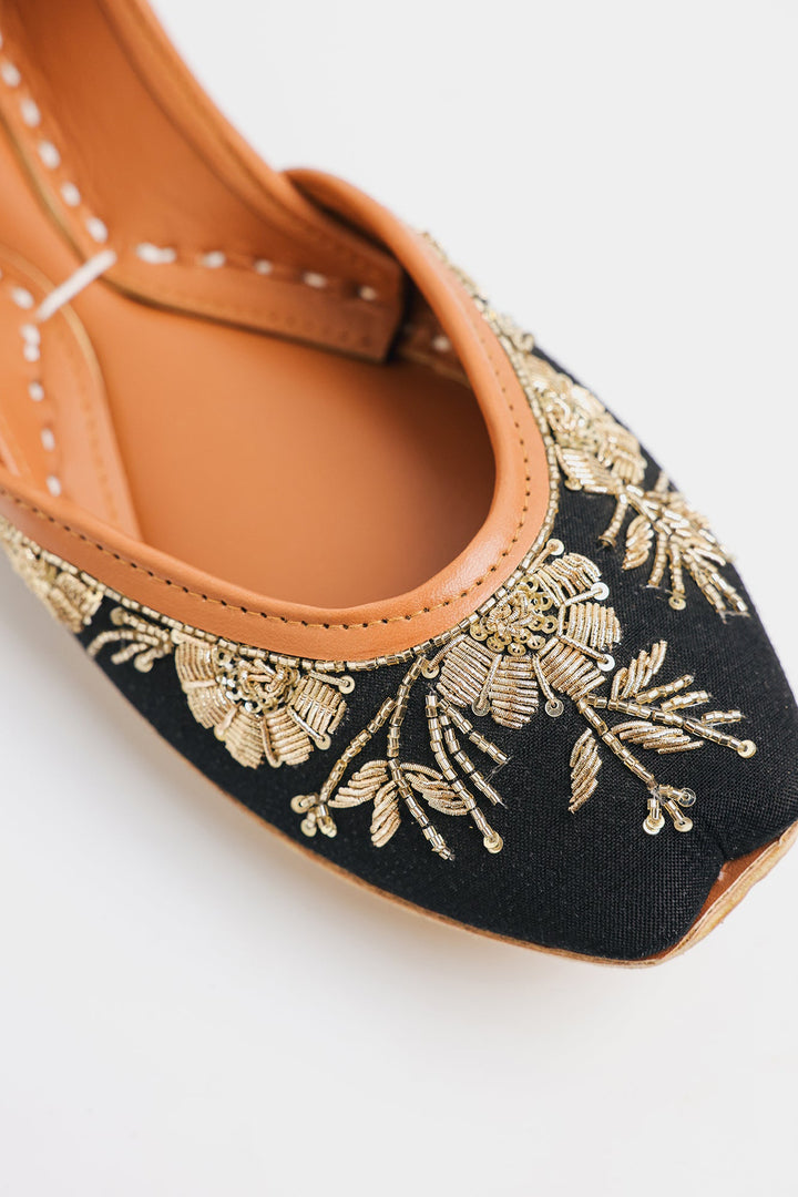 These khussa have a black fabric upper adorned with intricate gold embroidery featuring floral patterns. The embroidery includes metallic threads and possibly beads or sequins, creating a rich and ornate look. They appear elegant and are likely intended for festive or formal occasions.
