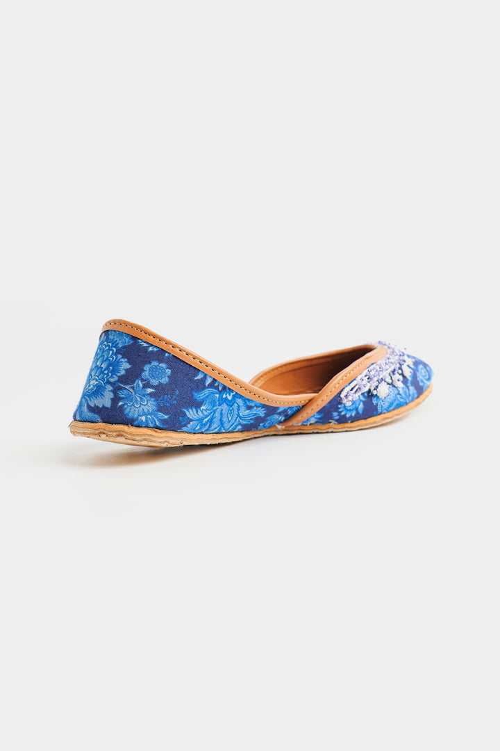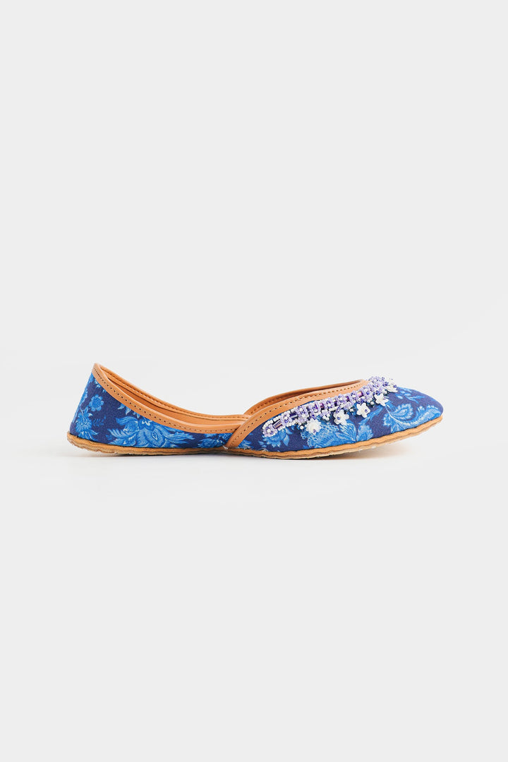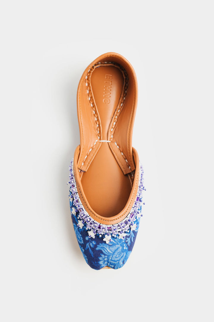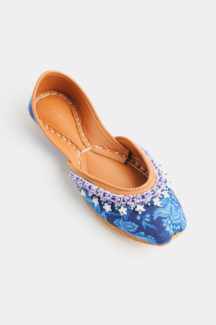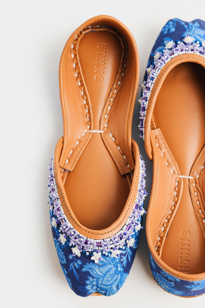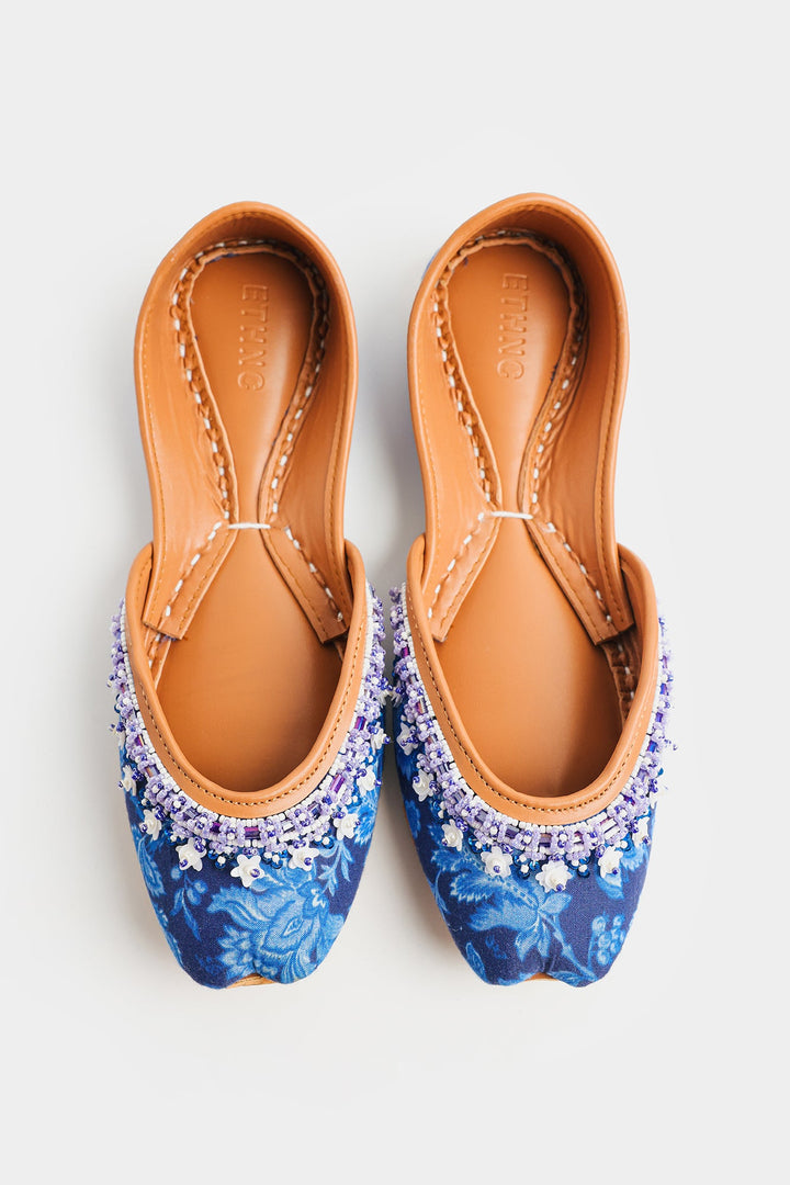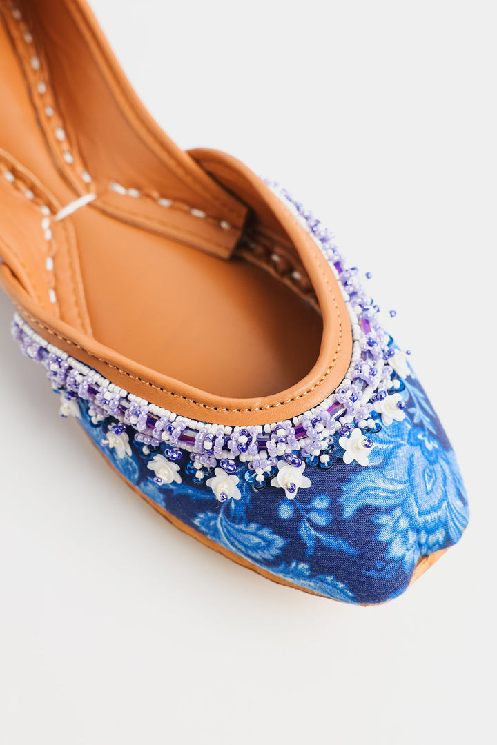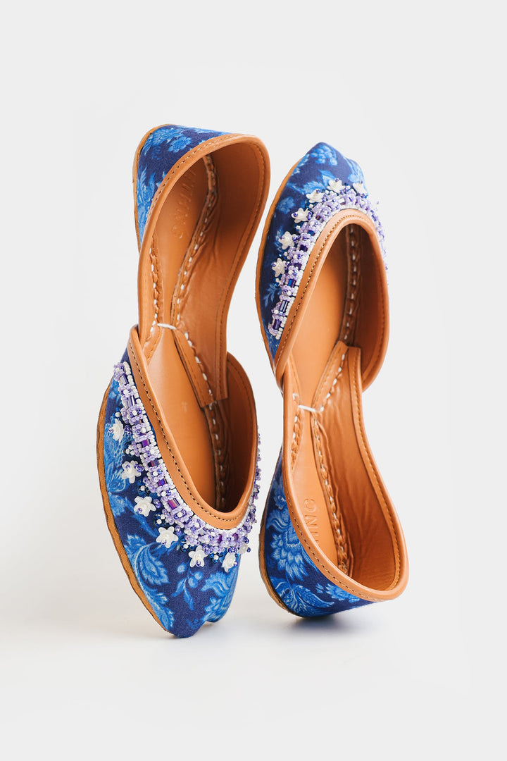 Step into timeless elegance with these exquisite Khussas. The deep blue fabric, adorned with delicate floral print in blue hues, provides a sophisticated backdrop for the stunning hand-stitched beadwork. A harmonious blend of blue, white, and lavender beads adds a touch of refined sparkle and texture to the front of each shoe. Crafted with a comfortable tan leather sole and lining, these Khussas effortlessly combine traditional charm with contemporary style, making them a perfect statement piece for any occasion.