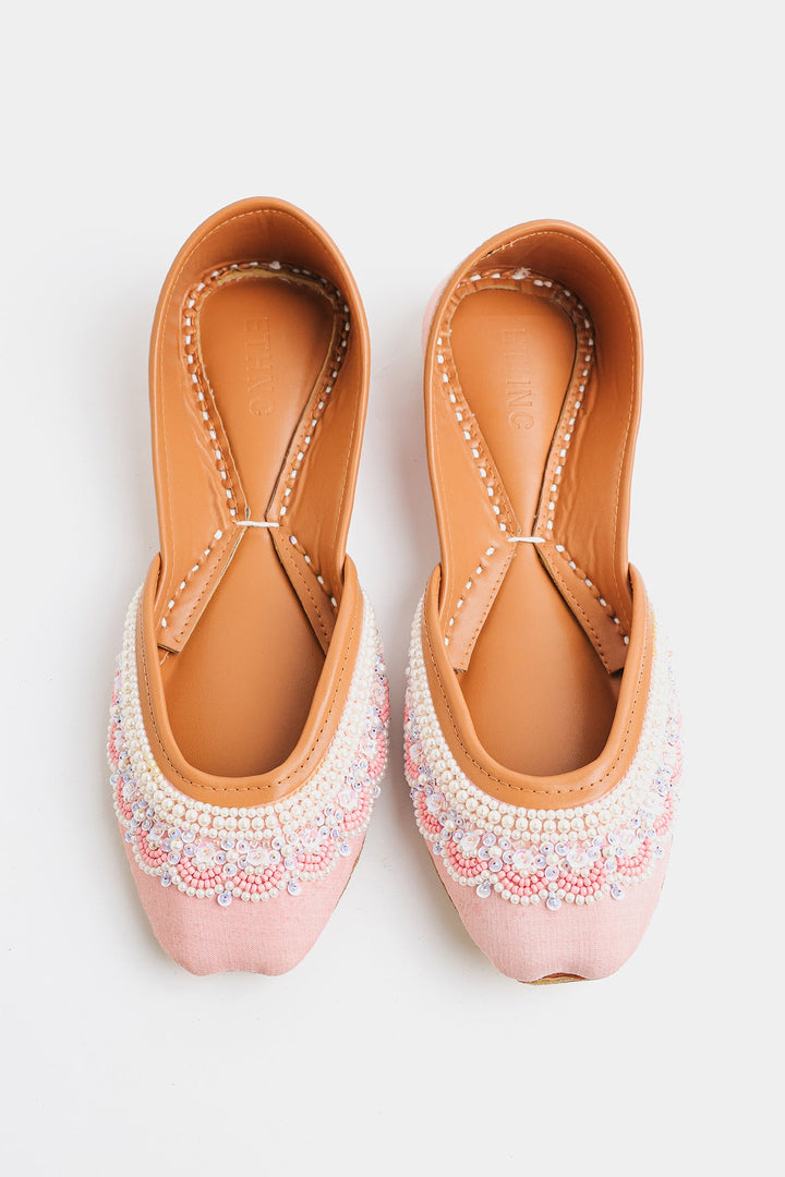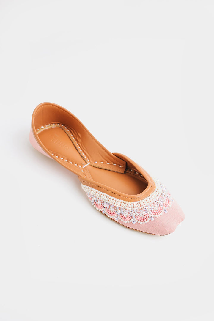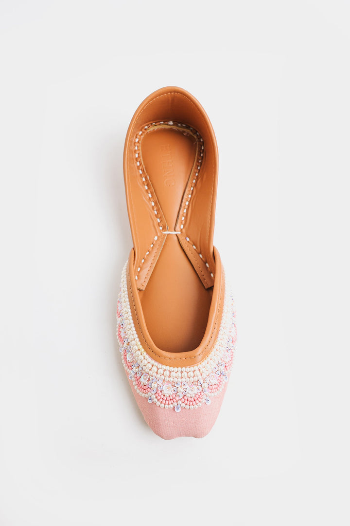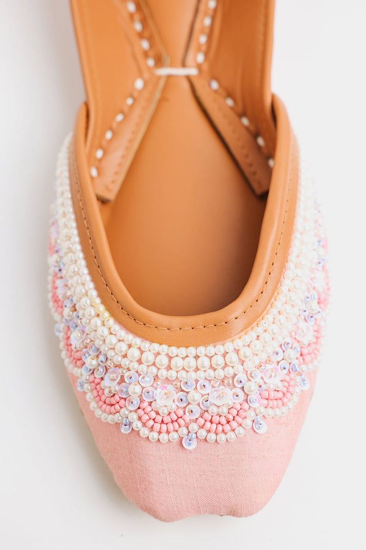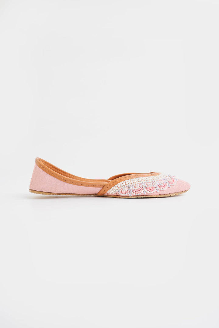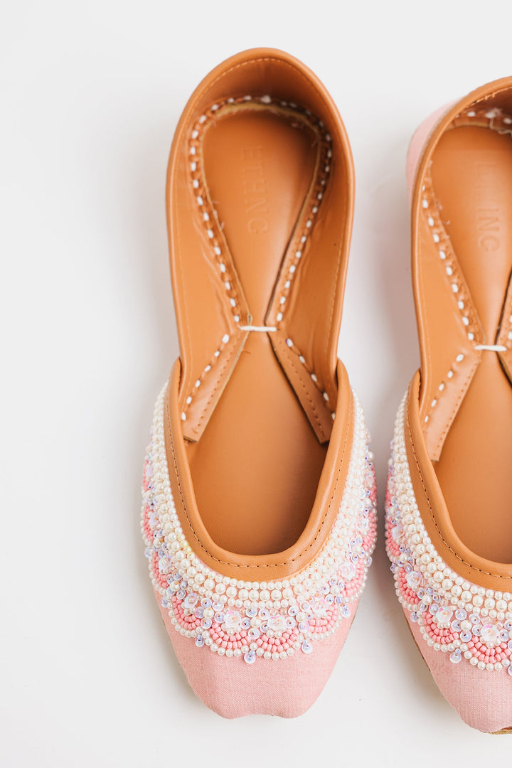 This pastel pink khusa is beautifully adorned with a touch of elegance to your outfit. Made with delicate craftsmanship, these embellishments elevate the style of these traditional shoes, perfect for any occasion, comfort and fashion with this exquisite footwear.