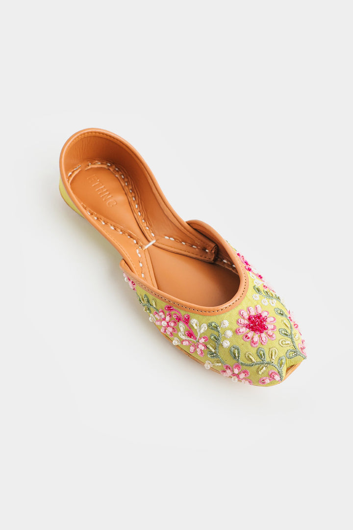 Handcrafted with a refreshing pastel palette, these Khussas are a tribute to traditional elegance. The light sage green fabric serves as a beautiful canvas for the vibrant floral embroidery, featuring stunning pink flowers with intricate stitchwork. The design is further enhanced by delicate pink and white beads that create a sparkling border and add dimension to the floral motifs. With a comfortable tan leather sole, these shoes are a perfect blend of timeless artistry and modern charm.