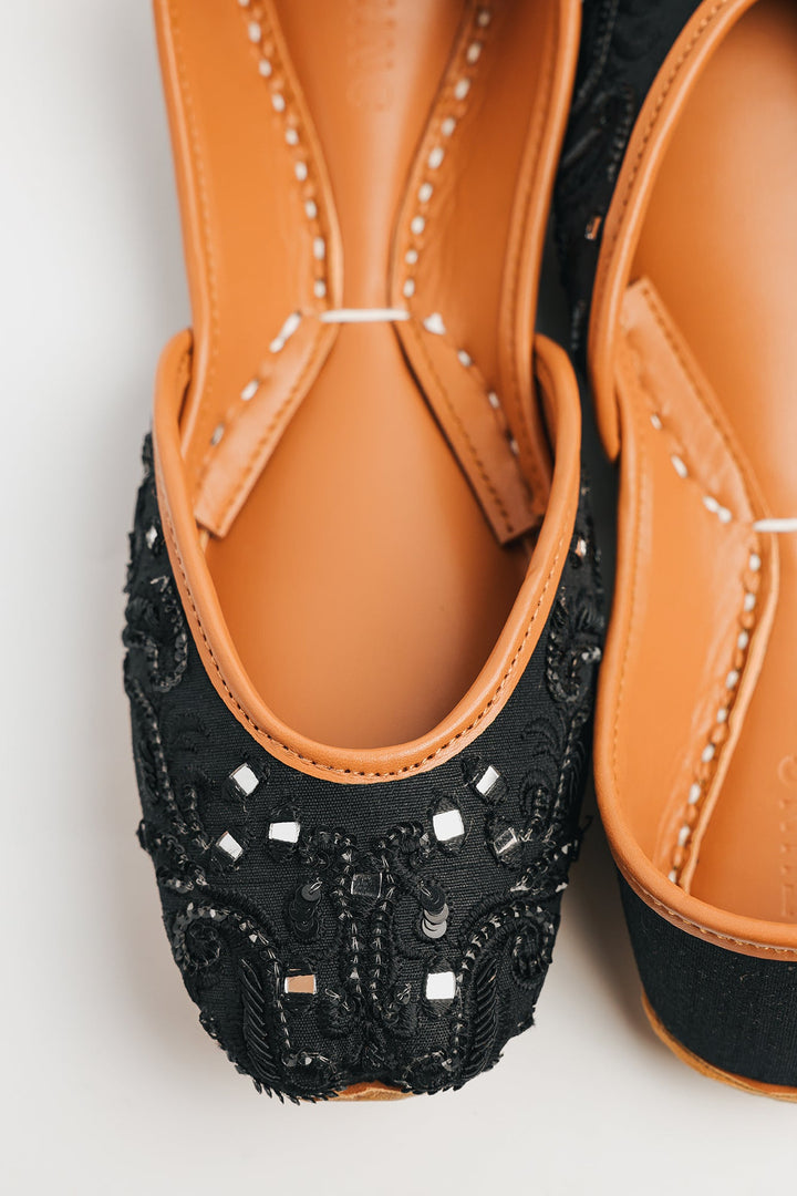 Adorn your feet with the timeless elegance of these classic black Khussas. Featuring a classic silhouette and delicate beadwork, they are a perfect blend of traditional craftsmanship and modern style, ideal for any occasion.-Black Color