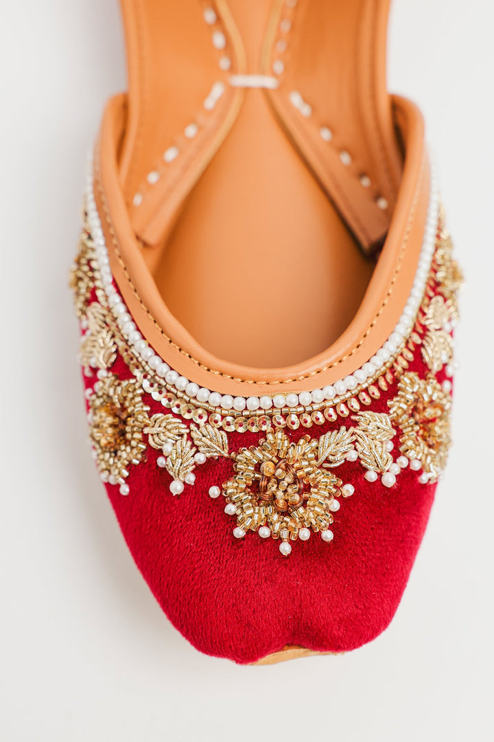 Set against a rich red suede base, these khussas feature intricate gold beadwork, delicate pearls, and shimmering gold embroidery. The detailed, floral-inspired pattern creates a truly majestic look, while the warm, tan leather lining ensures a comfortable fit. These opulent khussas are the perfect accessory for adding a touch of regal elegance to your festive attire or special occasion outfits.