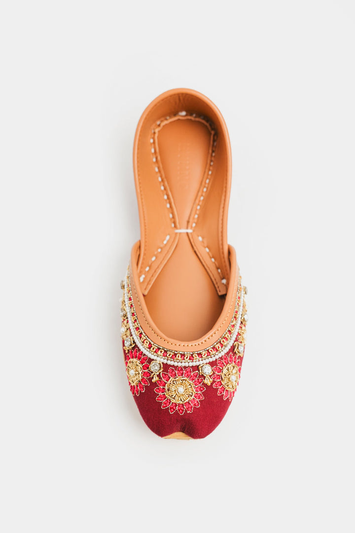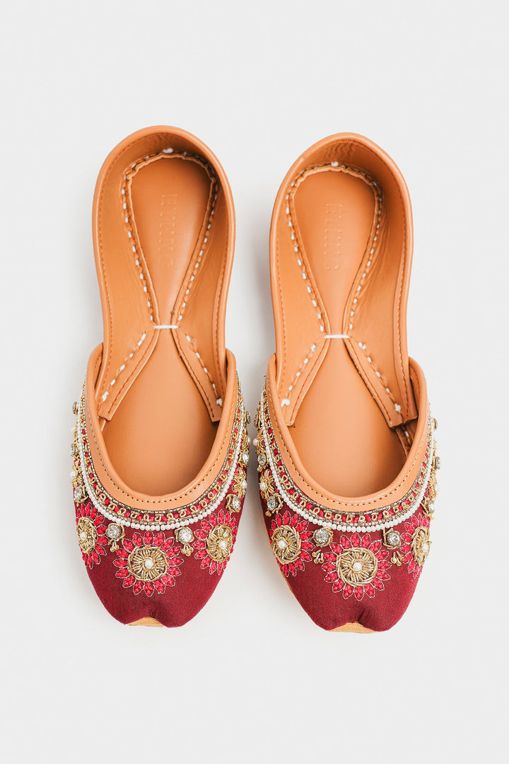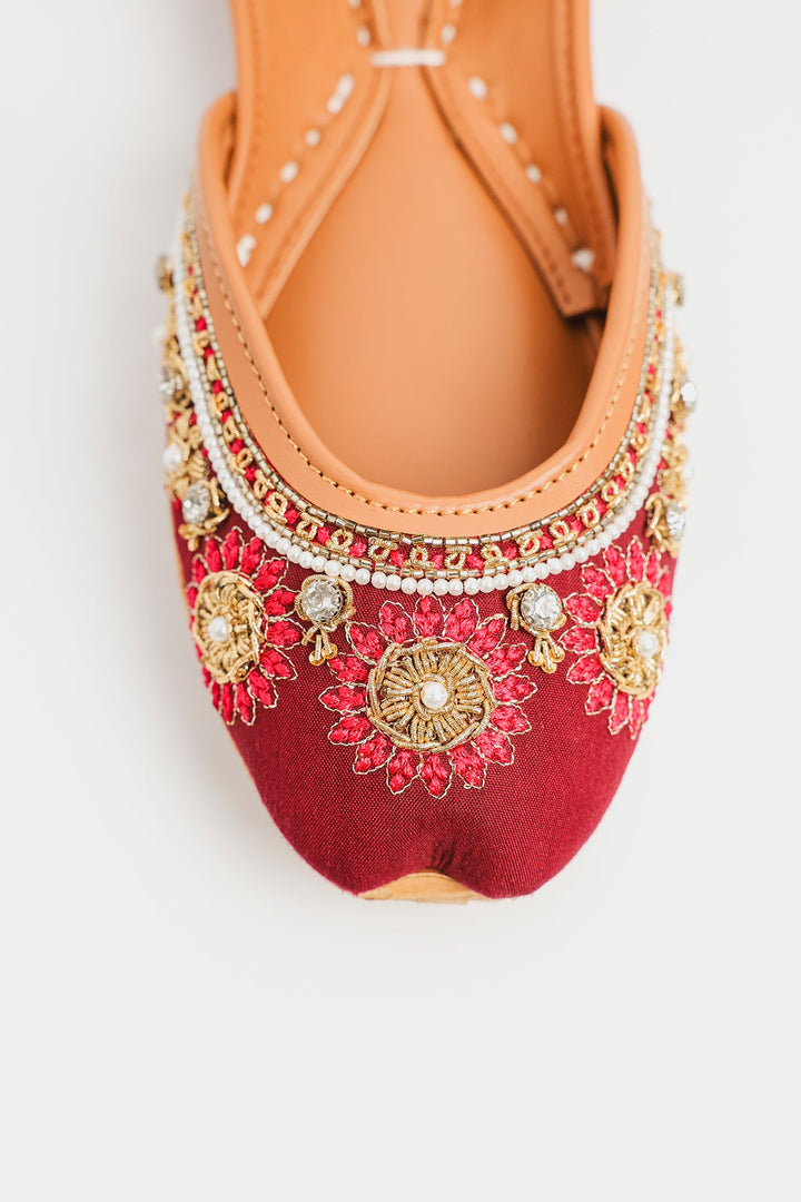 Crafted on a deep burgundy base, these khussas are a masterpiece of intricate embellishment. They feature stunning gold and silver embroidery, delicate white pearls, and shimmering red beads that create a rich and opulent design. The warm, tan leather lining and cushioned insole provide exceptional comfort, making them perfect for any special occasion. These beautiful khussas are a versatile accessory that will add a touch of timeless elegance and sophistication to your festive wardrobe.