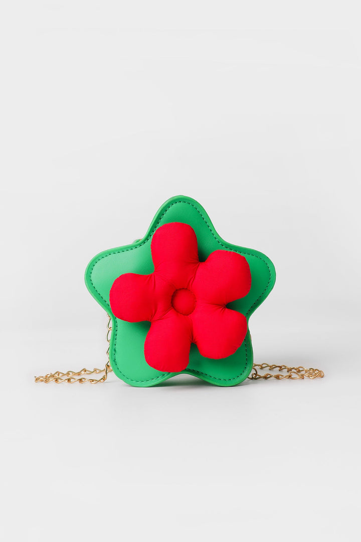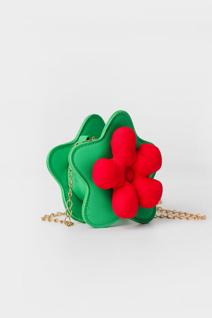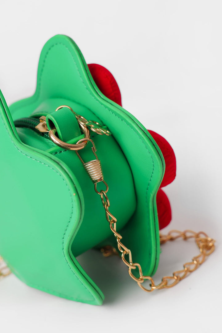 An enchanting design is portrayed on this trendy floral silhouette bag rendered in appealing green shade and enhanced with a flower pop up attached at front in red color. It comes paired with a dazzling chain in appealing gold hues. Adorn this trendy bag for a style statement look.