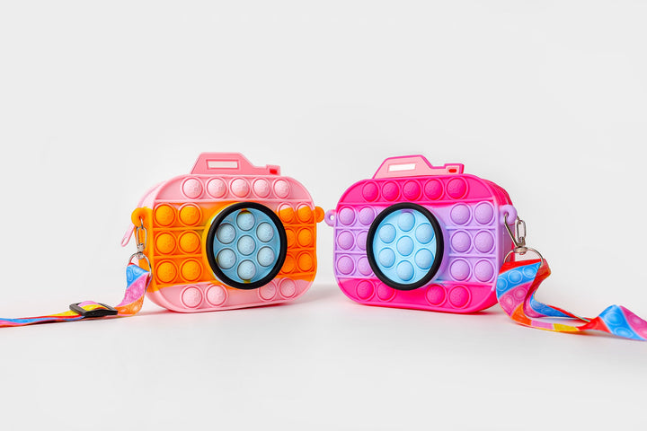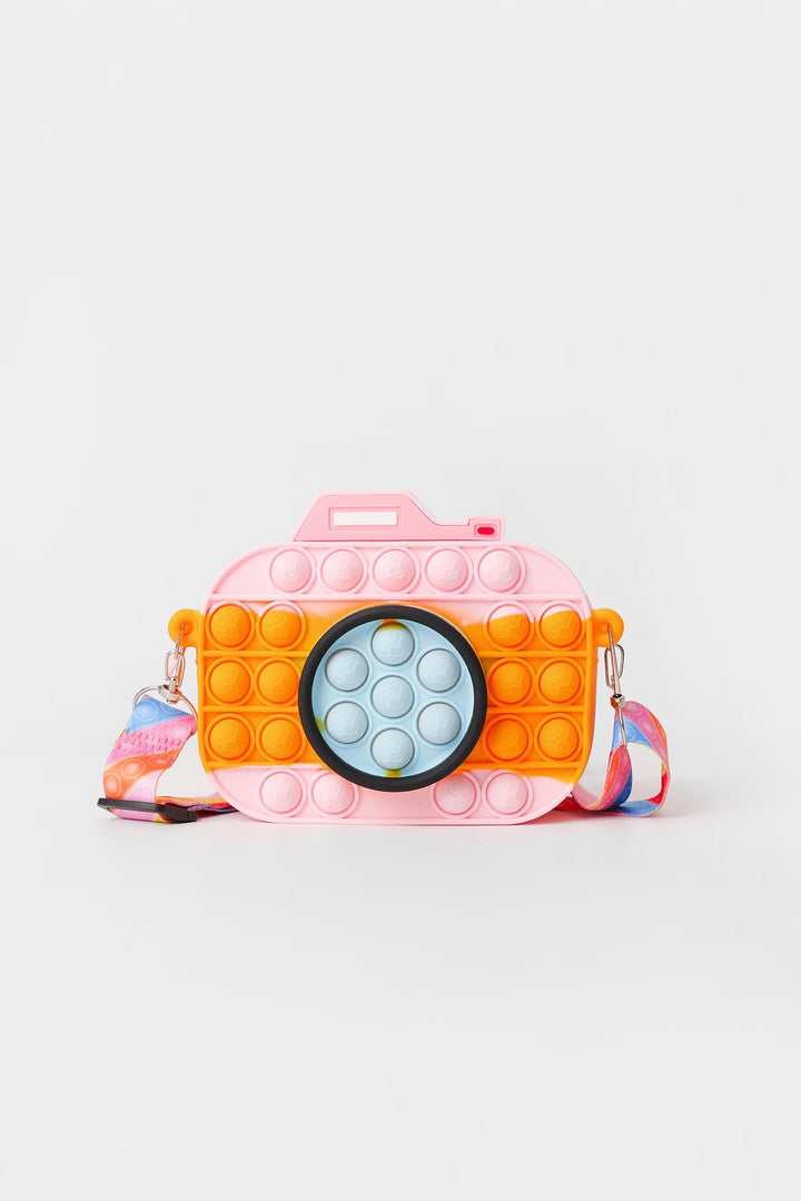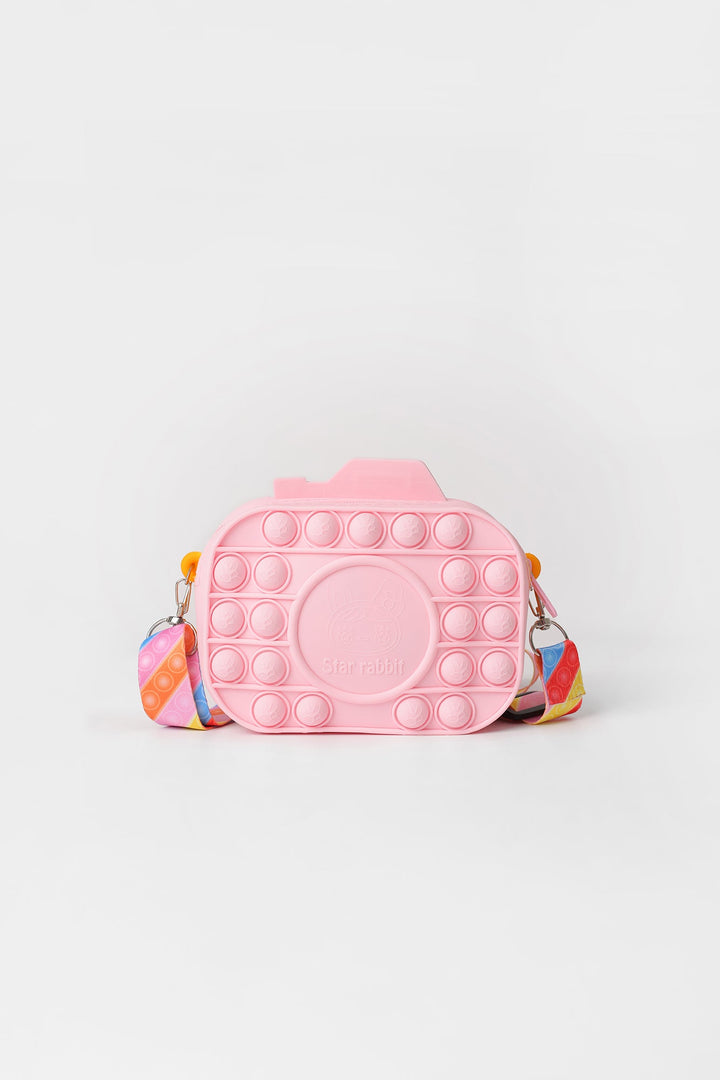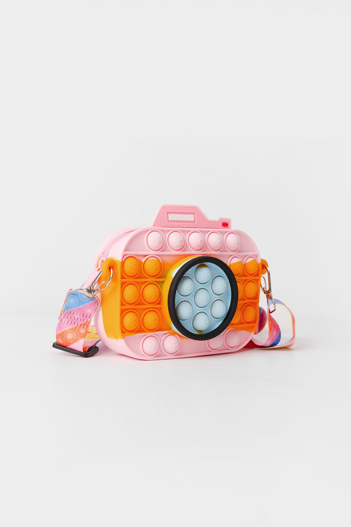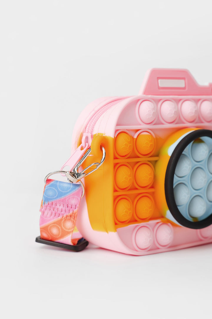 A fascinating design is portrayed on this trendy camera silhouette bag rendered in vibrant lemon yellow and pink shade. It comes paired with a quirky strap with rainbow color stripes printed in vibrant hues. Adorn this trendy bag for a style statement look.