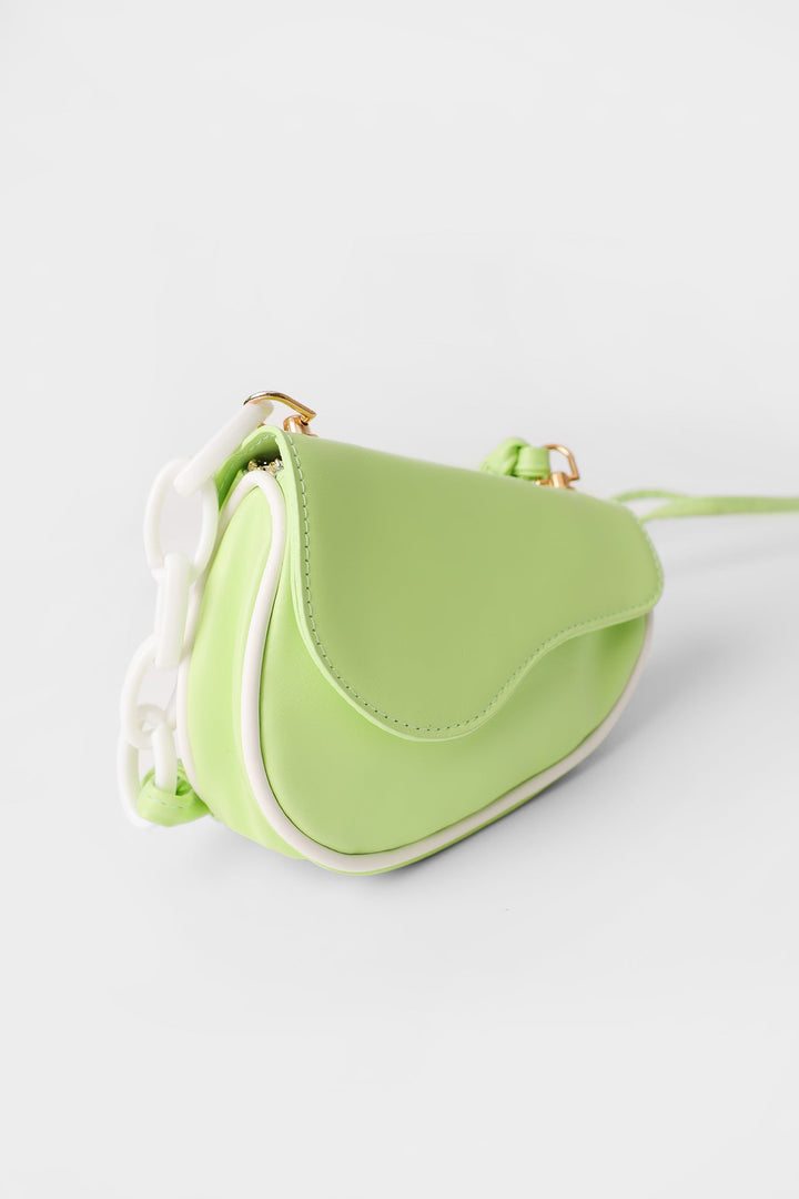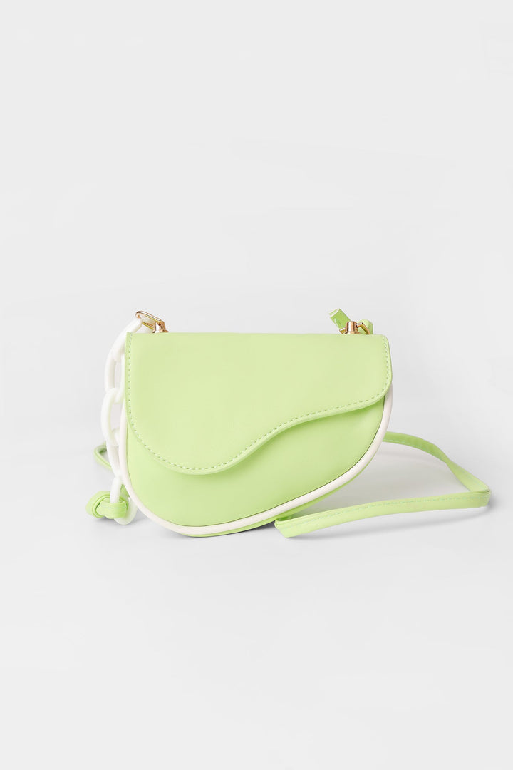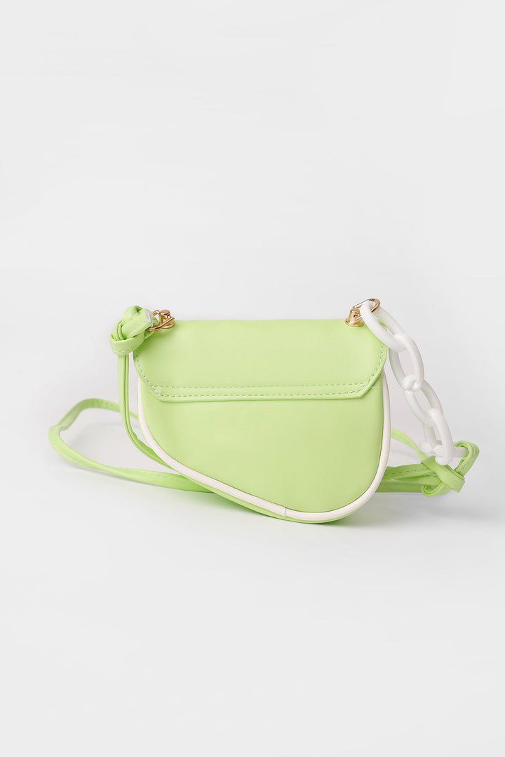 This contemporary cross body bag is defined by its prominent apple green color providing a vibrant look with a trendy silhouette. A perfect accessory for a statement look.