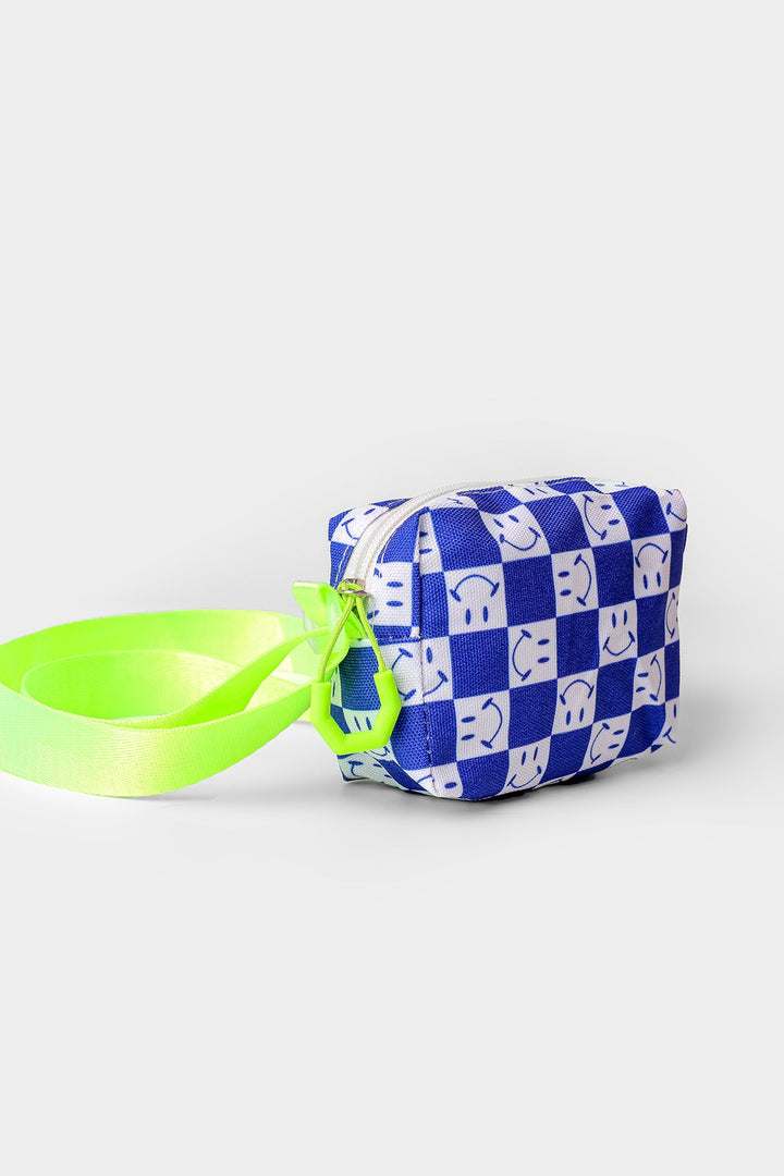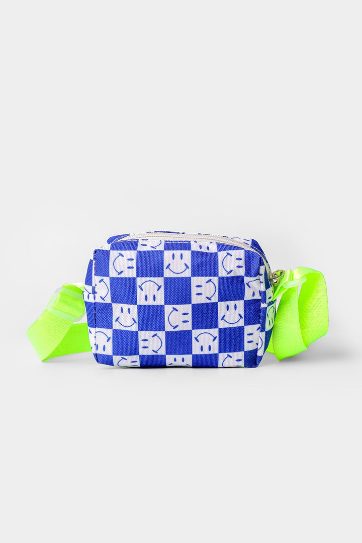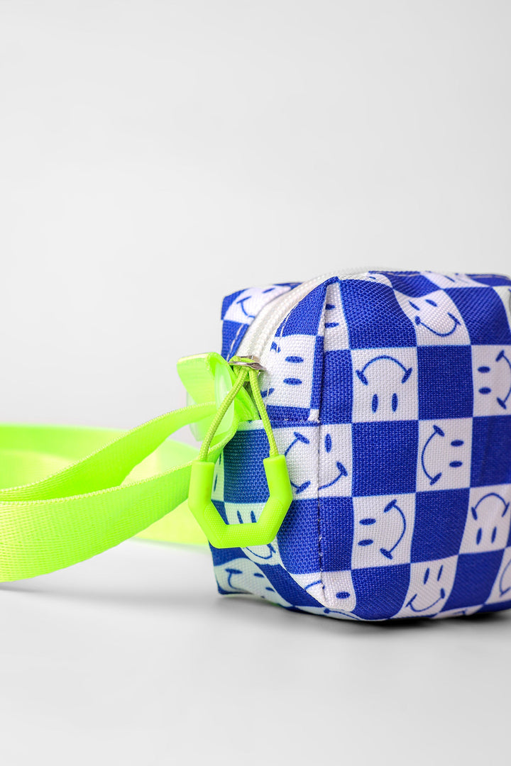 A quirky design is portrayed on this chic and trendy bag portraying an appealing rectangle silhouette rendered in ocean blue shade and illustrates captivating checkered design with a blend of white tones and illustrating smile illustrations. This comes with a classy strap, perfect to style with trendy outfits.