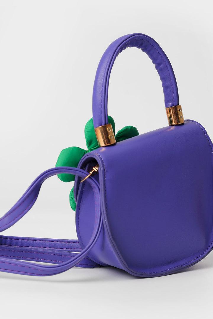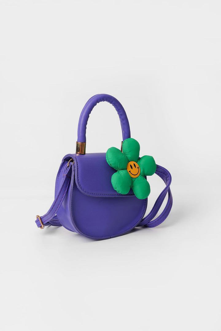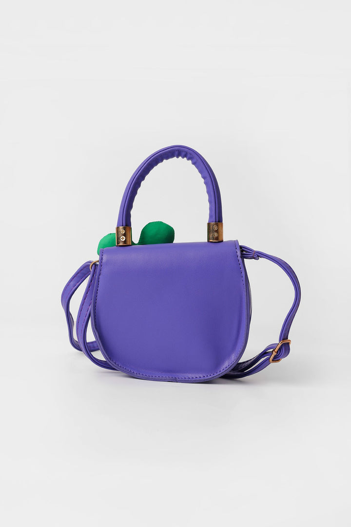 An enchanting design is portrayed on this trendy silhouette bag rendered in a majestic lavender shade. It comes paired with a strap and a floral add on at front to enhance the overall trendy look.