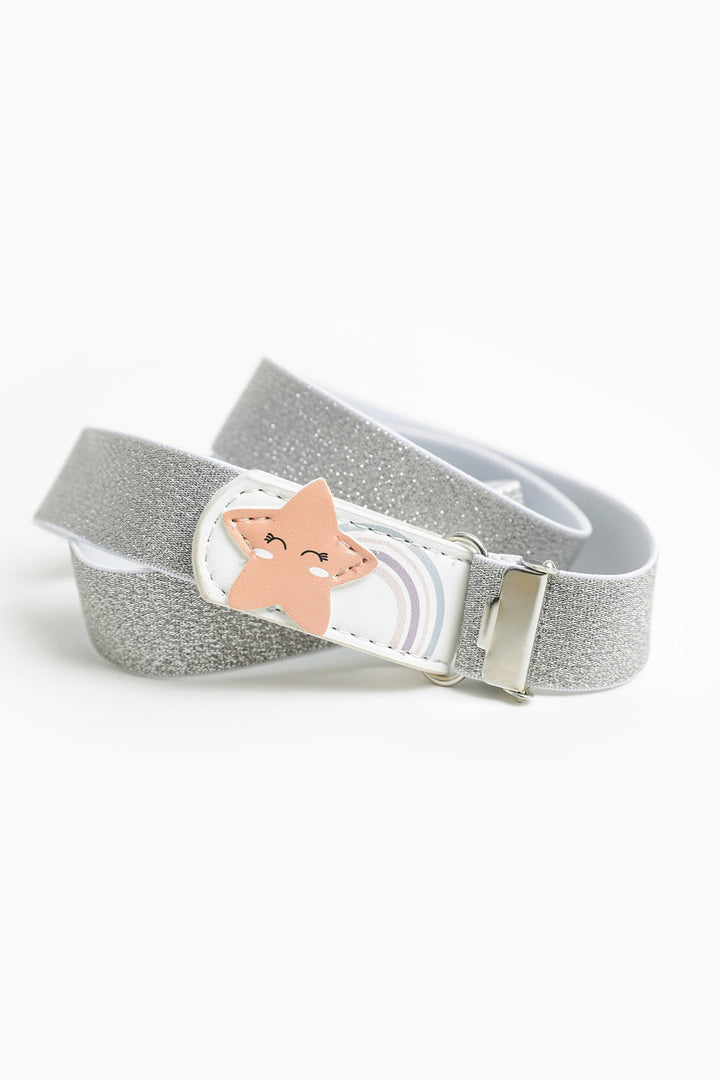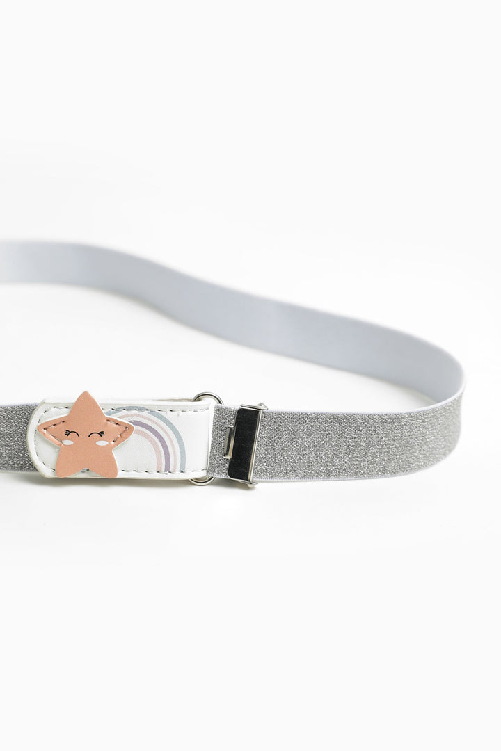 Silver toned glittered skinny belt for kids featuring star silhouette with rainbow illustrations printed at strap buckle, adjustable fit and push stud fastening. This elegant belt is a great option for your girls to embrace this classy look.