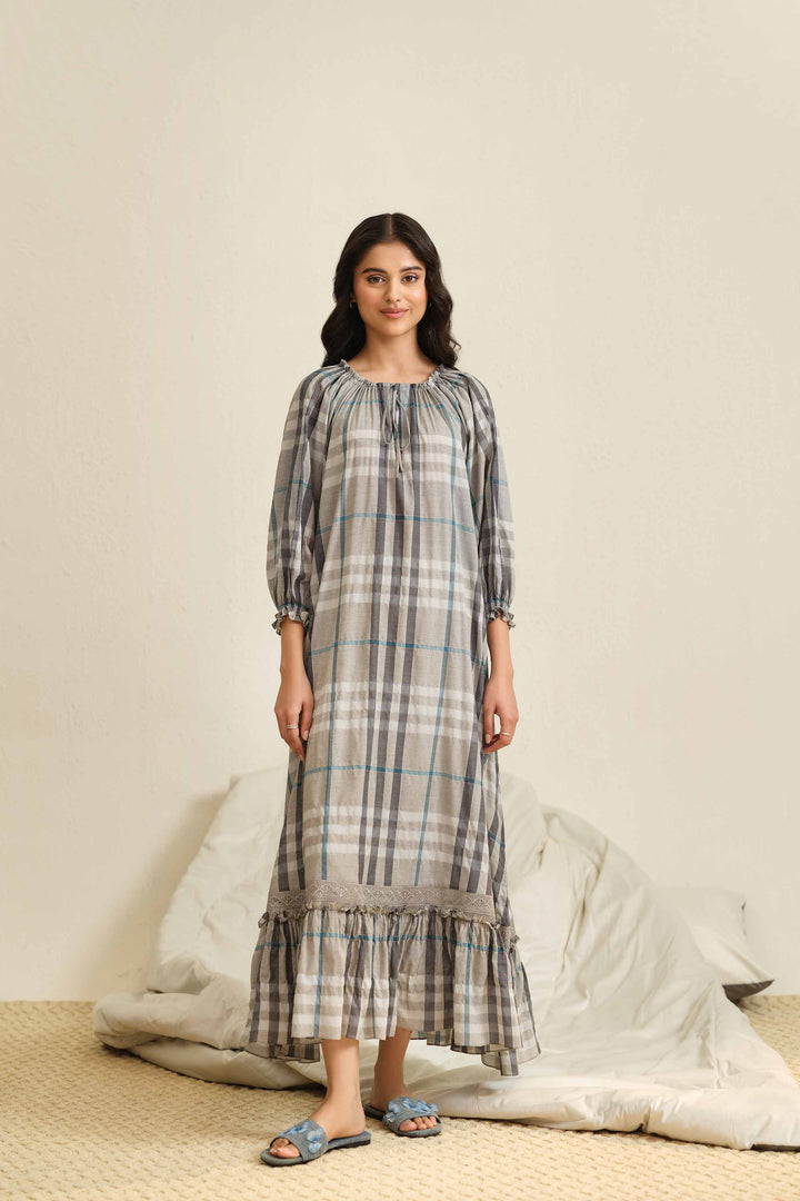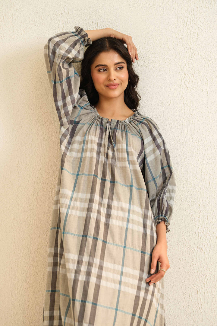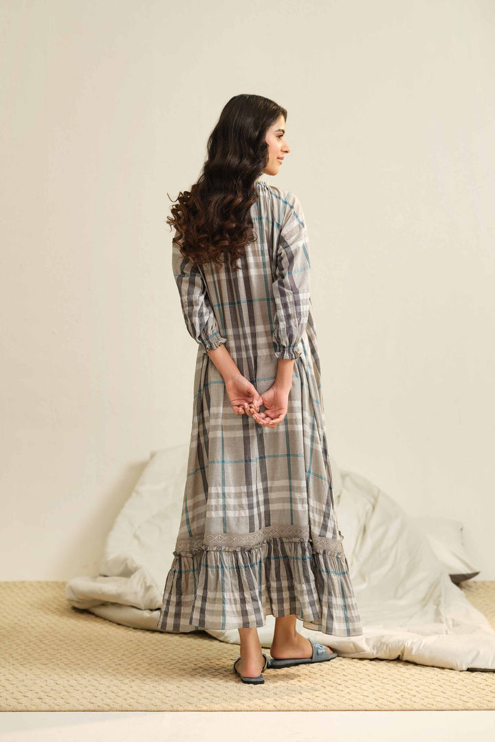 Square Neckline With Tie Up Dorri Detail, Reglan Sleeves Wit Gathers At Hem, Organza Embroidered Border At Tiered Hem, Long Checked Gown