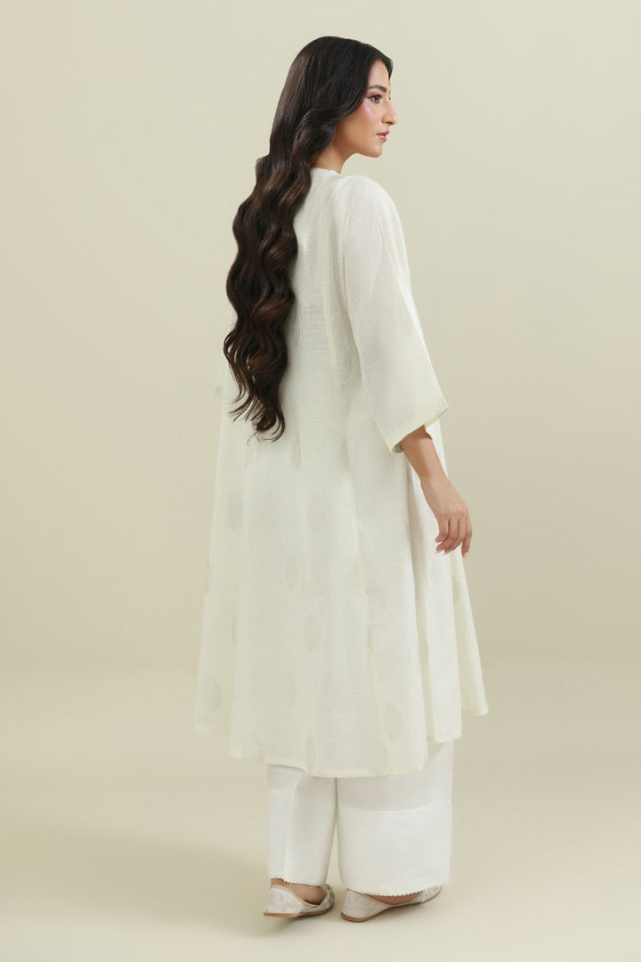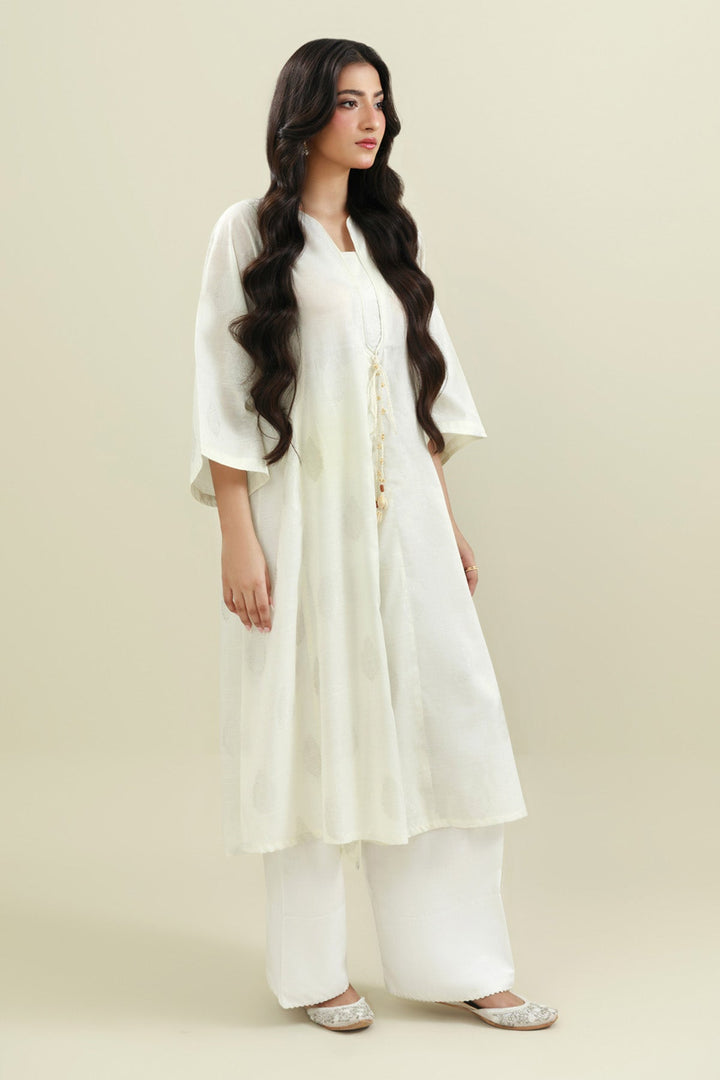 Round Neckline With Piping, Dori & Tassel Hanging Details at Neckline, Quarter Sleeves, Paneled Shirt