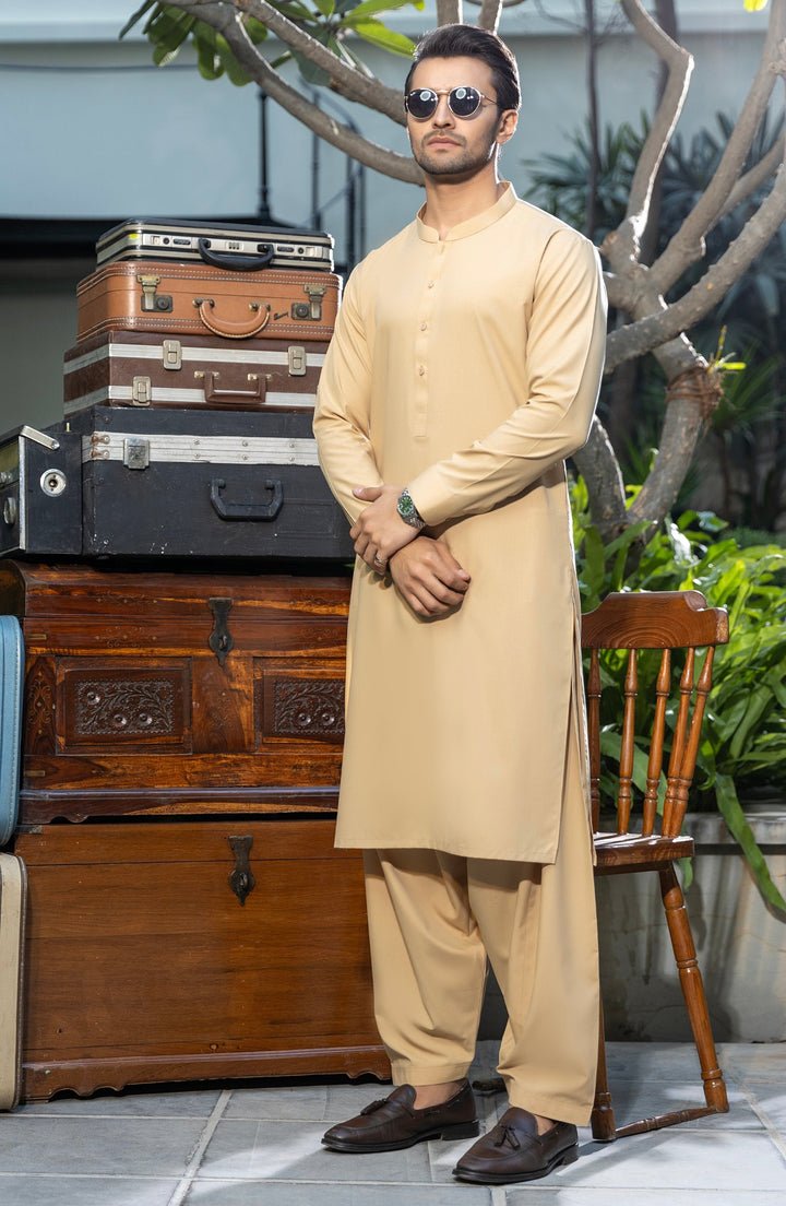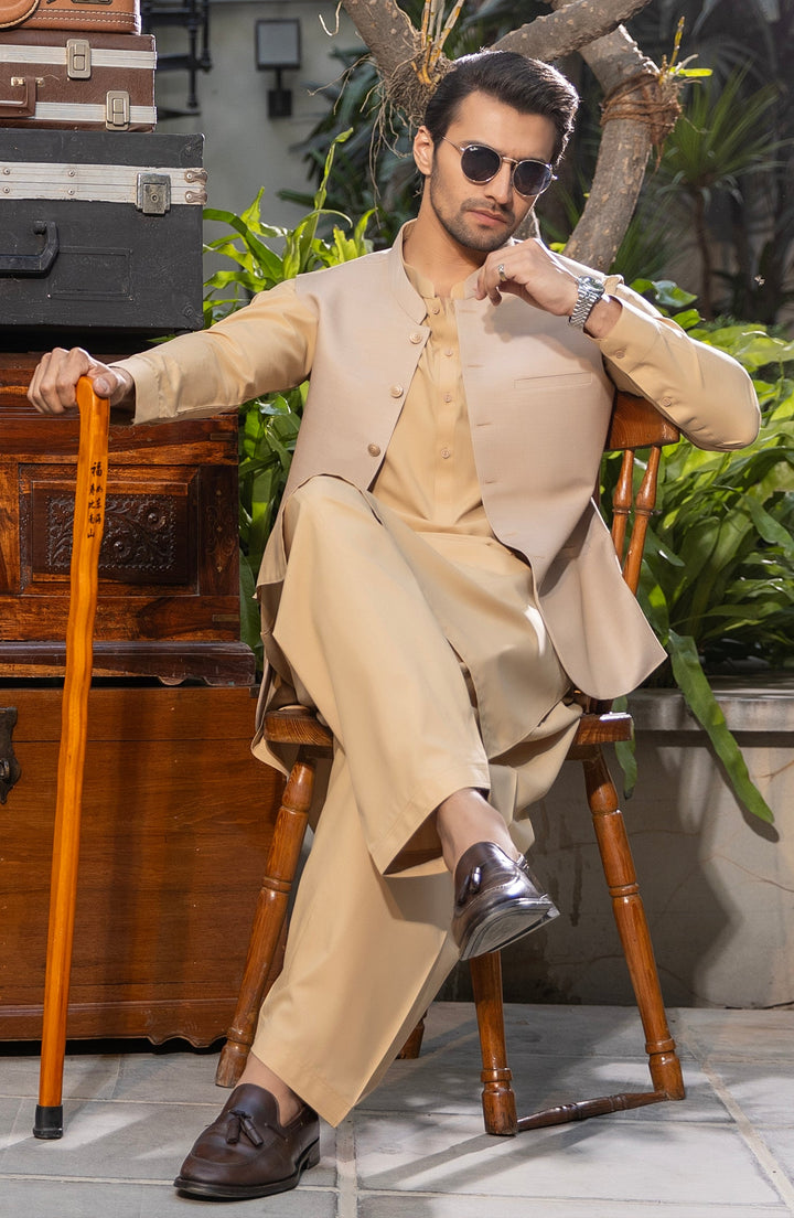 LIGHT BEIGE KAMEEZ SHALWAR WITH WAIST COAT