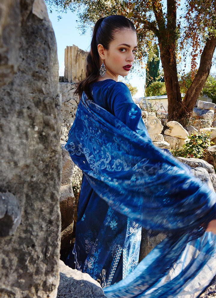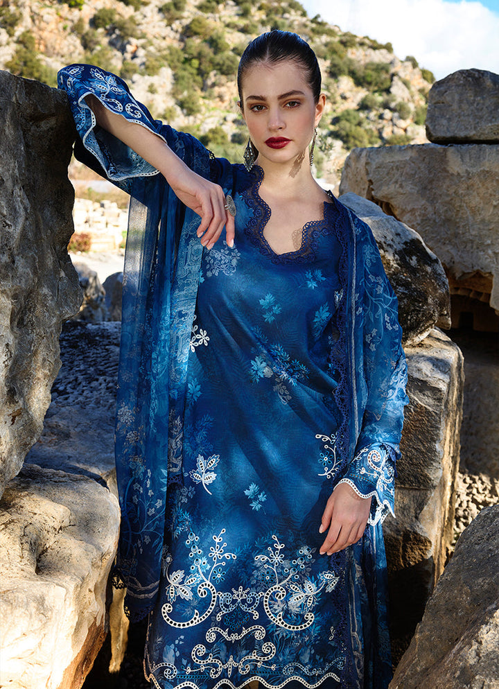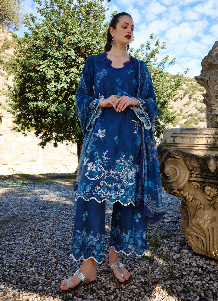 Liyana in Navy Blue from our Spring Printkari '25 Collection. A printed cutwork embroidered cotton 3-piece outfit paired with digital printed chiffon dupatta.