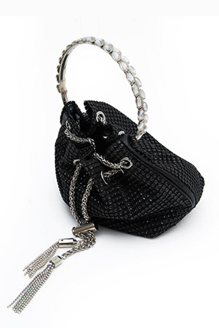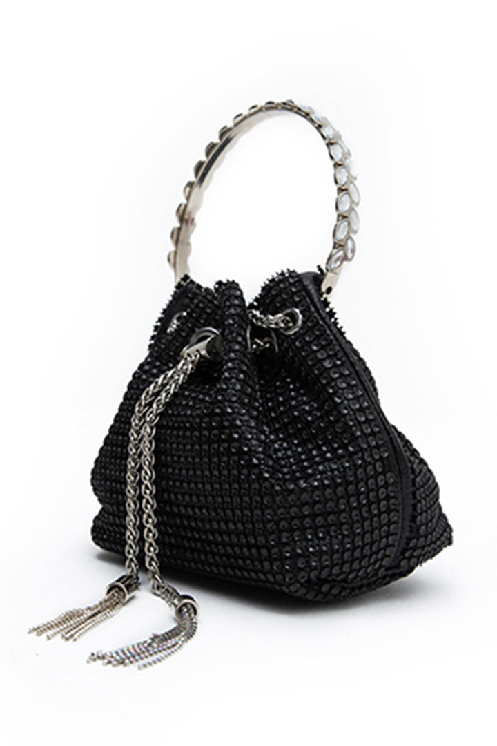 Black Crystal Mesh bag with silver handle on it, and chain drawstring closure