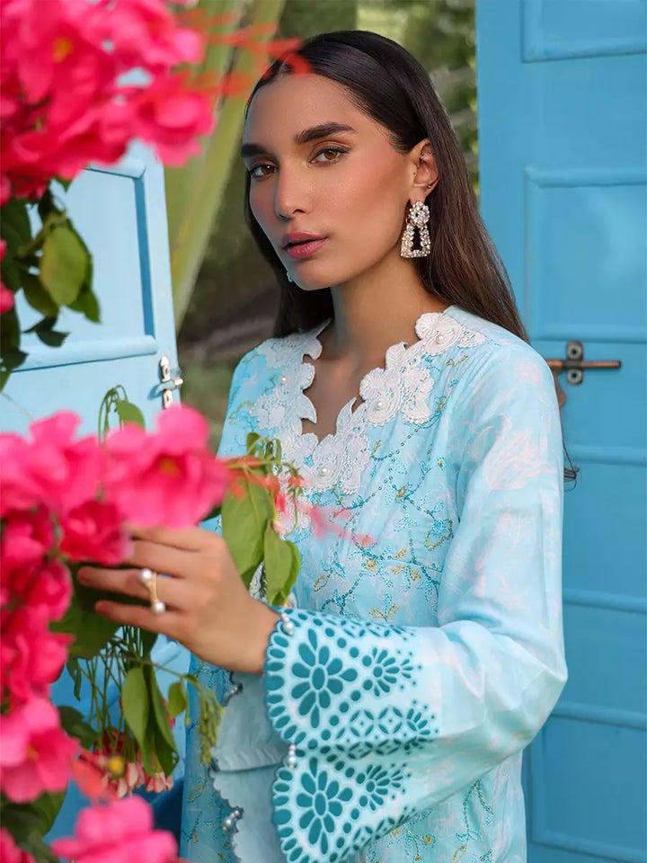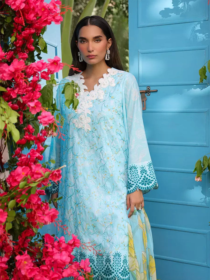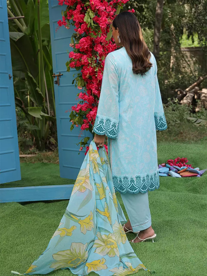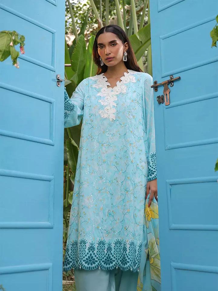 Elevate your look with this chic cambric printed and embroidered shirt, paired with a flowing printed chiffon dupatta. Complete the outfit with a perfectly dyed cambric trouser for a graceful finish
