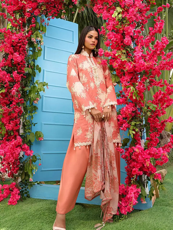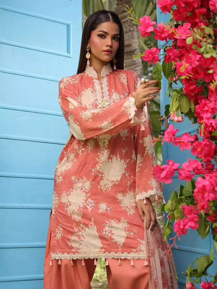 Elevate your look with this chic cambric printed and embroidered shirt, paired with a flowing printed chiffon dupatta. Complete the outfit with a perfectly dyed cambric trouser for a graceful finish