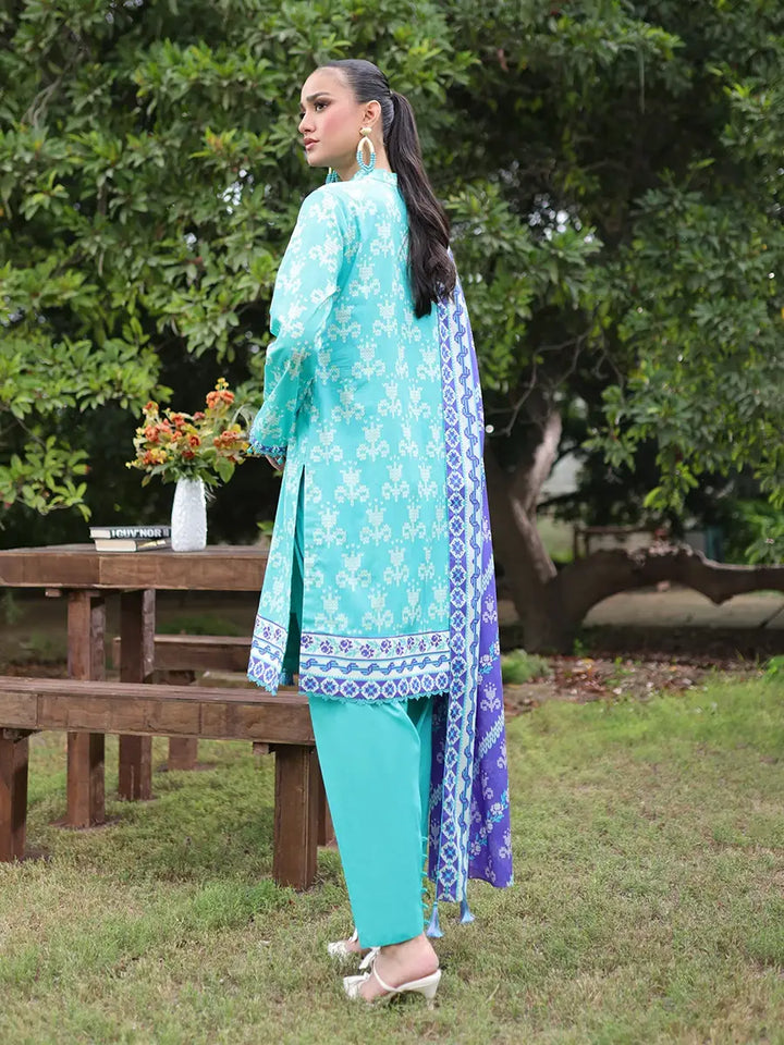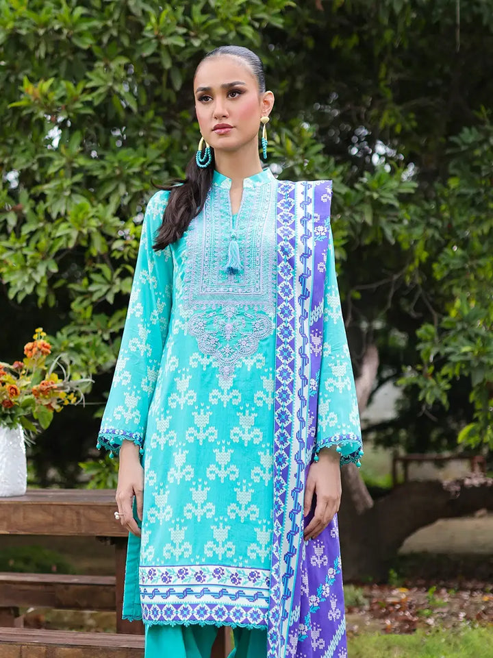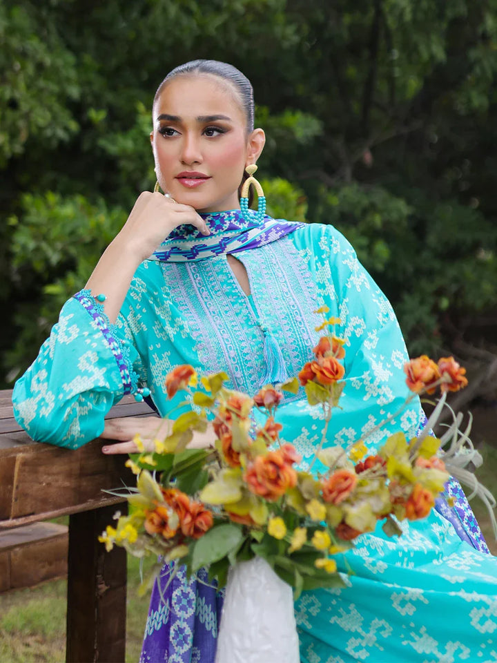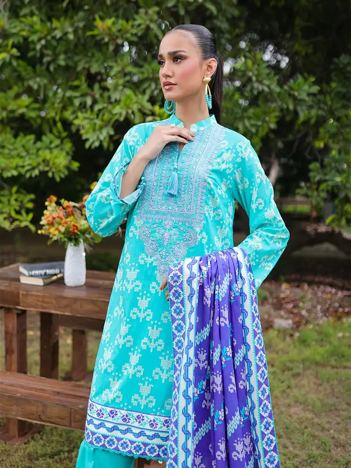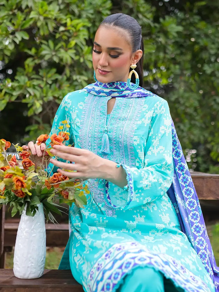 Elevate your style with this stunning blue 3-piece, featuring a printed cambric shirt and trousers, paired with an ethereal organza neckline