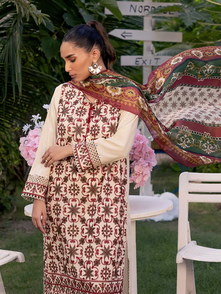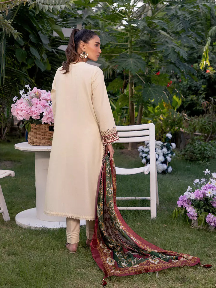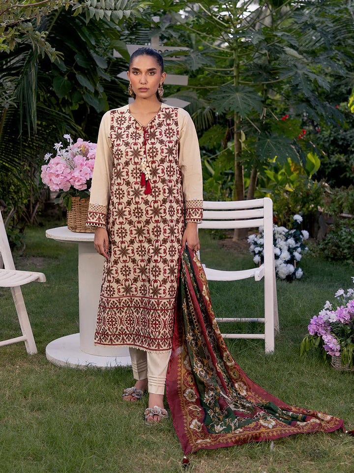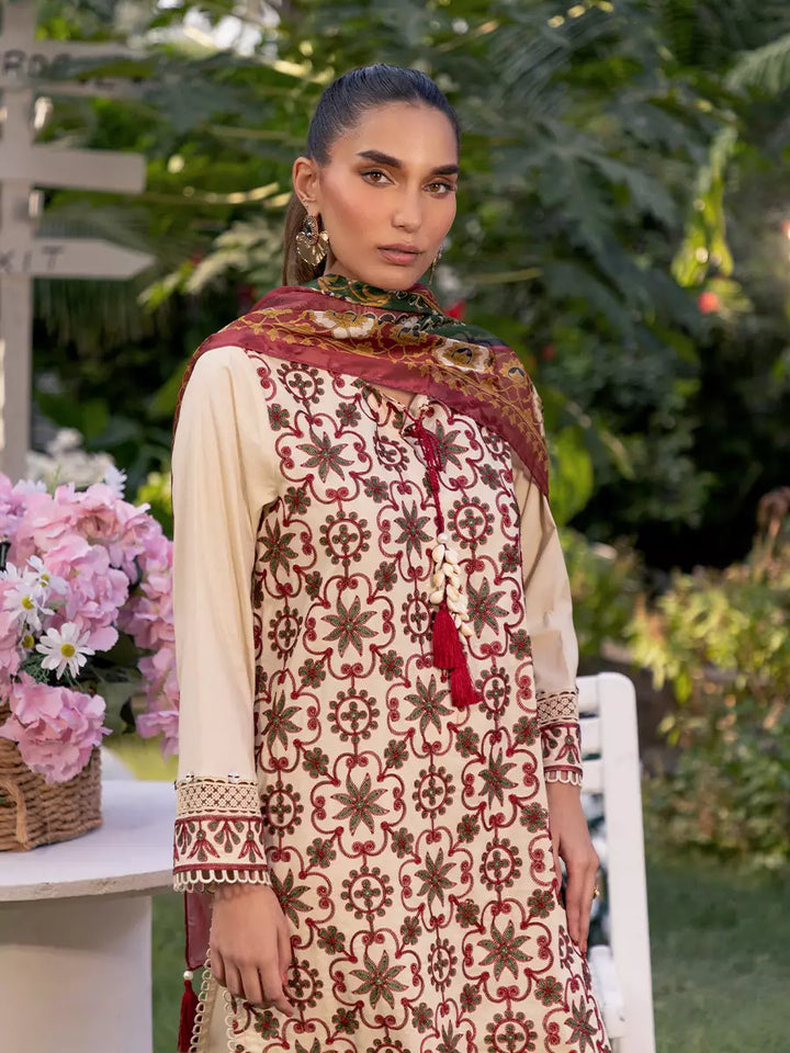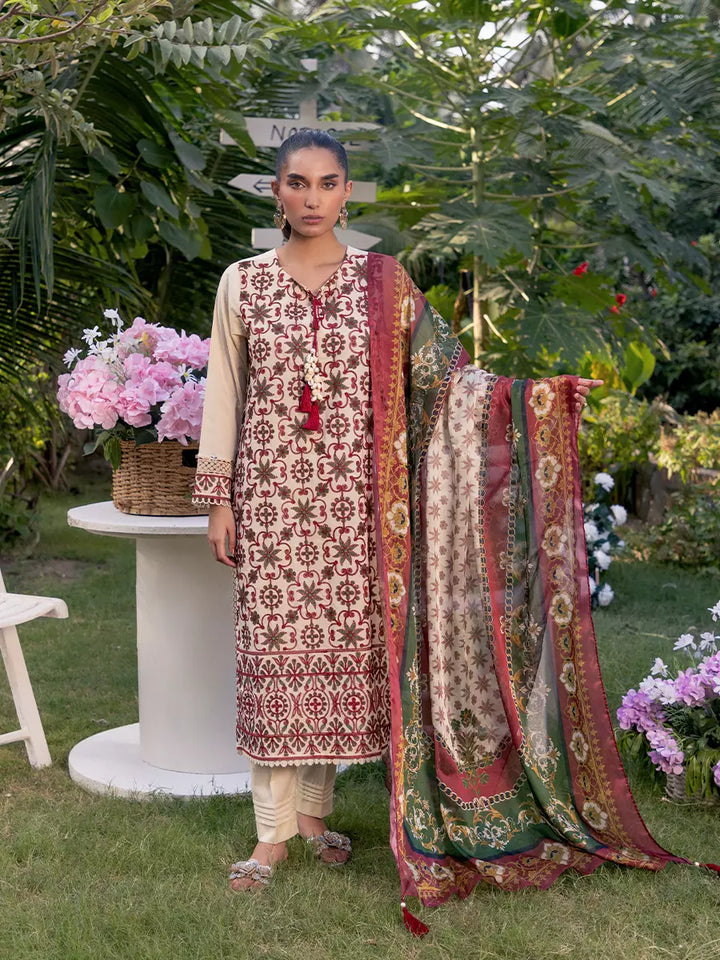 Experience elegance with this beige and red 3-piece unstitched suit, featuring intricate embroidery and paired with a luxurious silk printed dupatta. A stunning blend of subtle charm and bold style at an affordable price