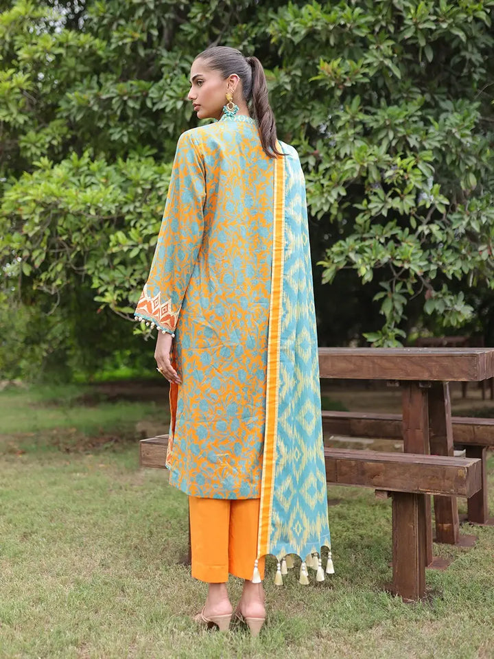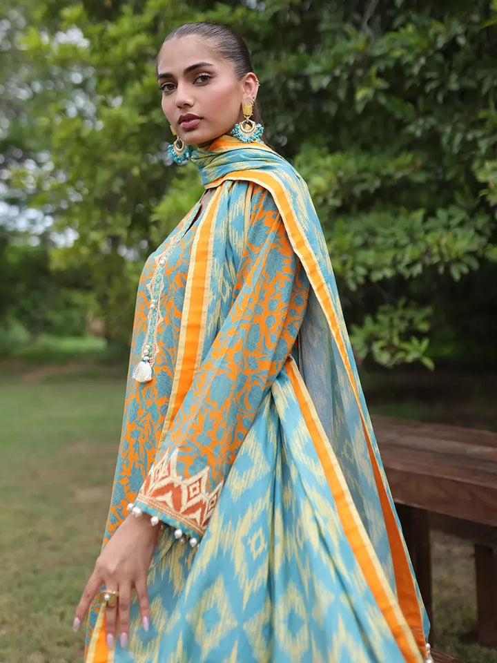 Brighten your look with our vibrant orange 3-piece, showcasing a cambric digital printed dupatta, complemented by a stylish printed shirt and trouser.