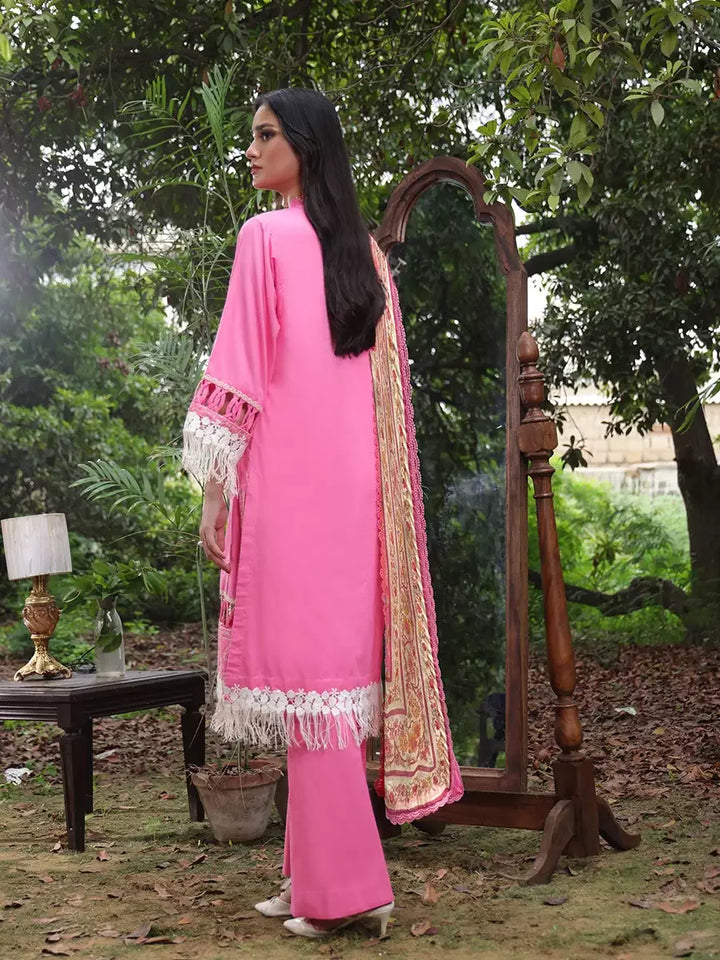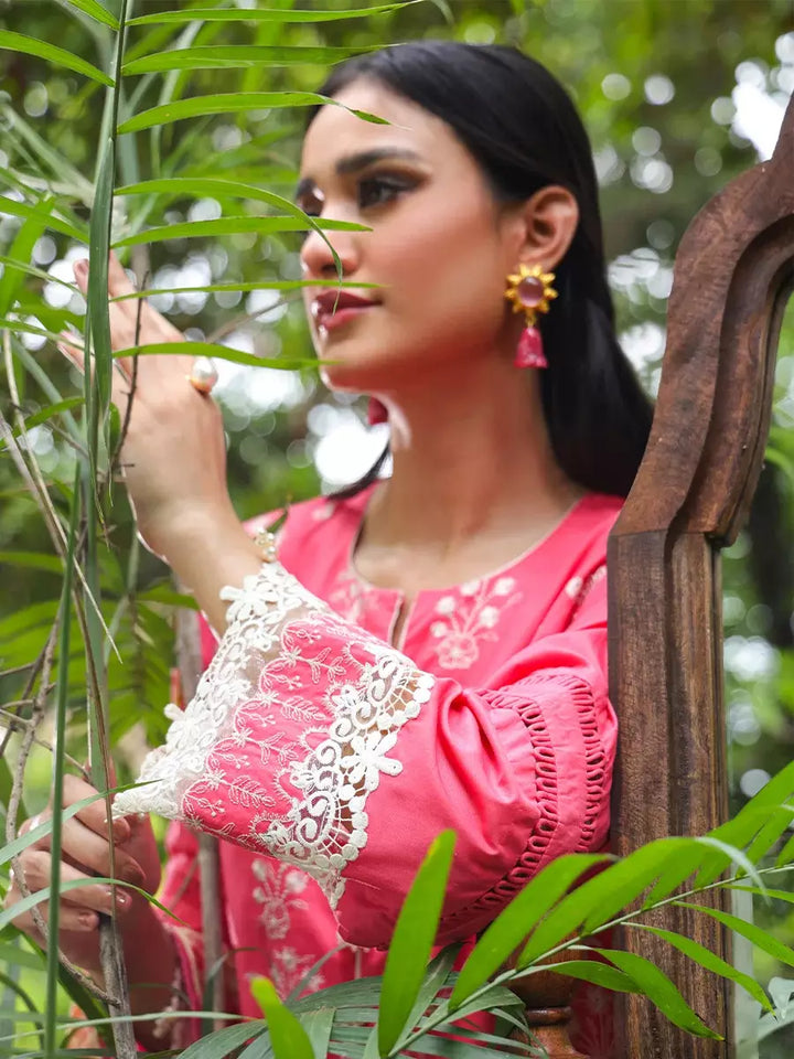 Radiant in bright pink: A regal three-piece suit with intricate embroidery and a net zari dupatta, blending royal elegance with ultimate comfort