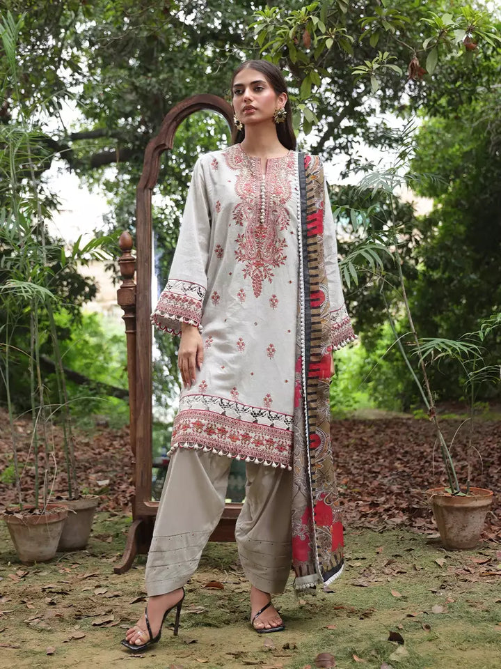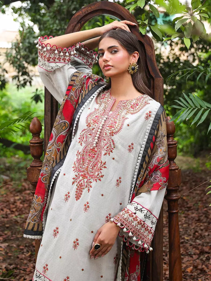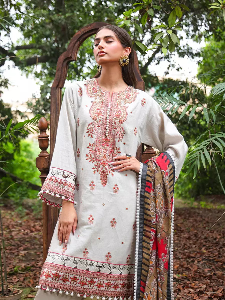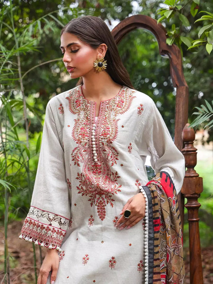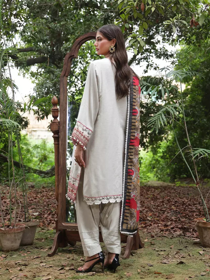 Elegant in ivory: A sophisticated three-piece suit with delicate embroidery and a Munar dupatta, blending classic charm with modern grace
