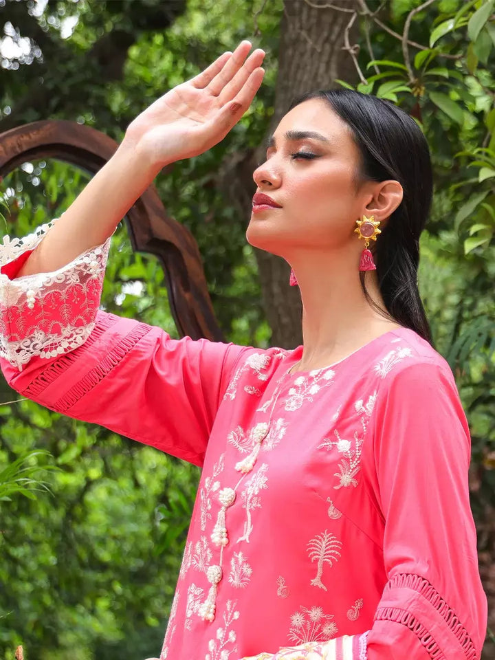 Vibrant in bright pink: A chic three-piece lawn suit with eye-catching prints, offering a blend of style and comfort