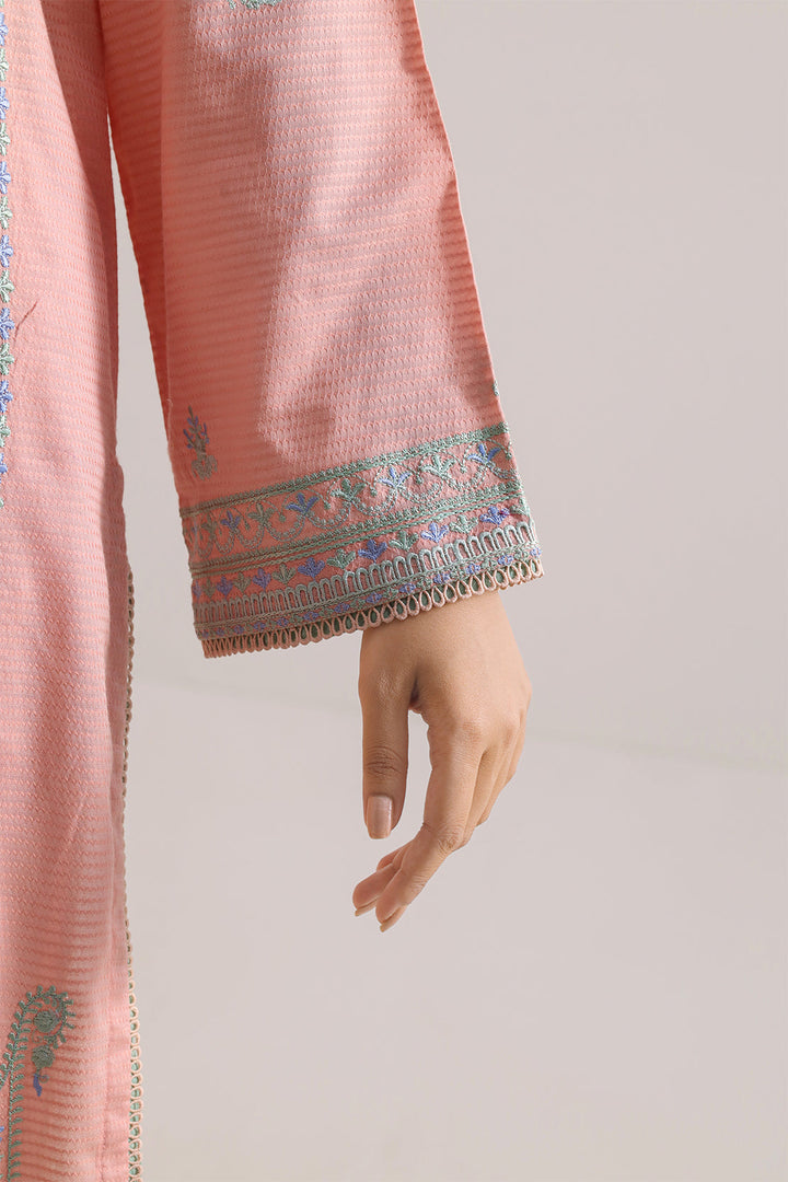 Elevate Your Occasion Wardrobe With This Refined Peach Luxury Pret Embroidered Cotton Jacquard Set By SAYA. Crafted In Opulent Cotton Jacquard Fabric, It Features An Intricately Embroidered Ready-To-Wear Shirt That Radiates Elegance, Paired With A Matching Jacquard Dupatta That Flows With Grace, And Tailored Dyed Trousers That Add Polished Structure Without Compromise. Perfect For Festive Celebrations, Formal Affairs, Or Daytime Events Where Sophisticated Style Demands Personalized Ease.