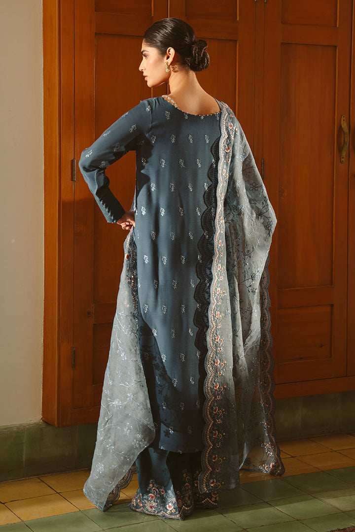 This MAJESTIC TEAL-3 PIECE EMBROIDERED SILK SUIT features a shirt with embroidered front, back, and sleeves, as well as a 120" embroidered patti for added detail. The trouser is also made from dyed silk, and the dupatta is made of embroidered net fabric.