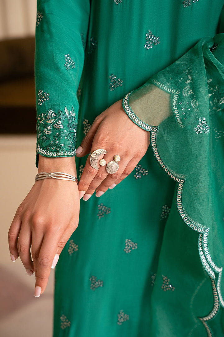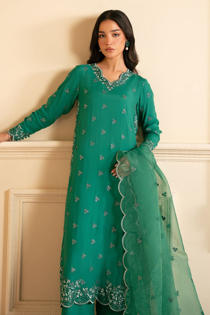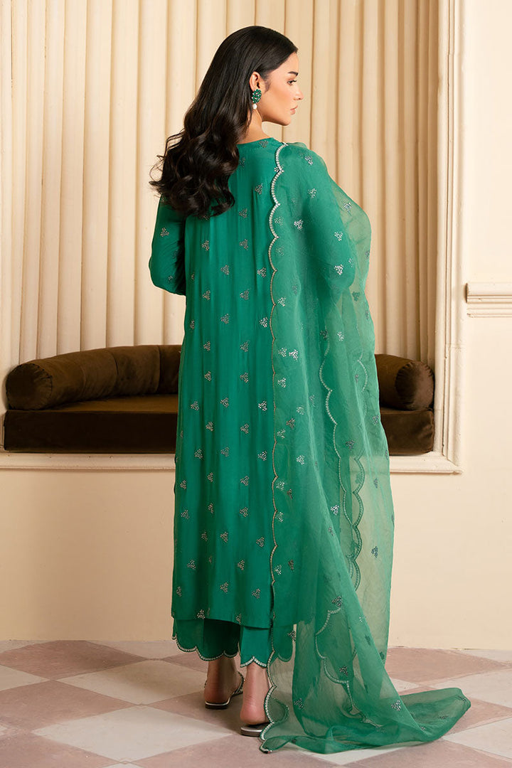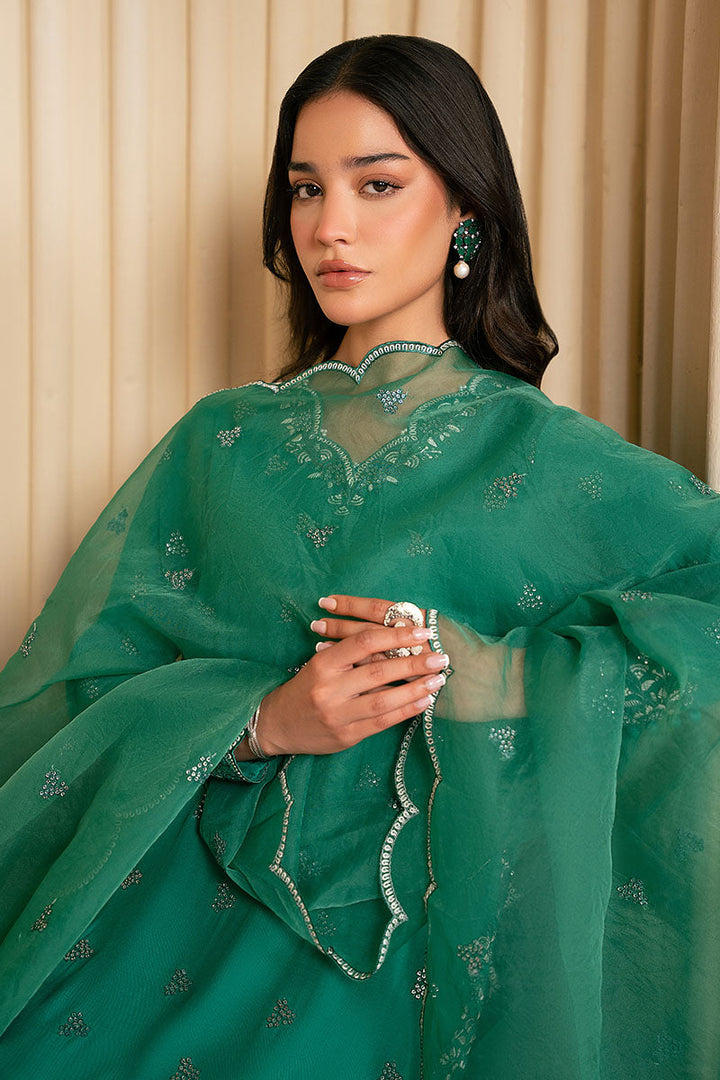 The MEADOW FUSION product features an elegantly embroidered, long A-line shirt made of silk, with intricate detailing on both the front and back. The neckline and sleeves are also adorned with embroidery, while the trousers are made of luxurious embroidered silk culottes. Complete the look with the included dupatta, made of organza and beautifully embroidered.