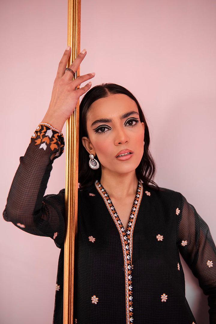 - THE FANCY MIDNIGHT CHARM IS A BLACK ORGANZA SHIRT THAT CAN BE WORN WITH CULOTTES AND BLACK HEELS. THE MATTE THREAD EMBROIDERY IS UPLIFTED WHEN STYLED WITH CONTEMPORARY SILVER EARRINGS TO STANDOUT IN THE CROWD