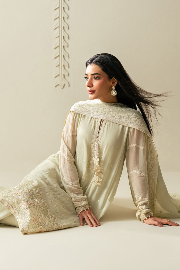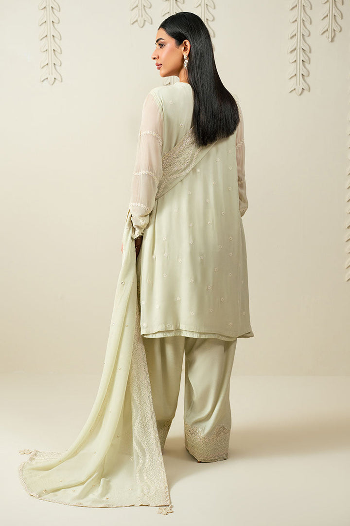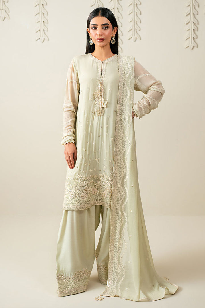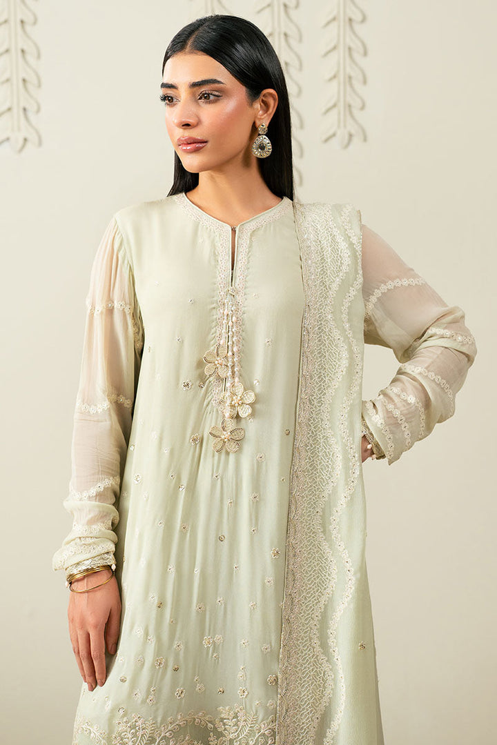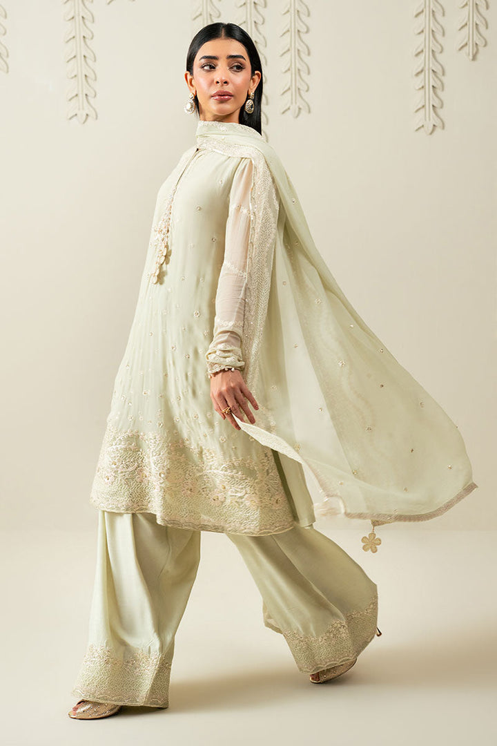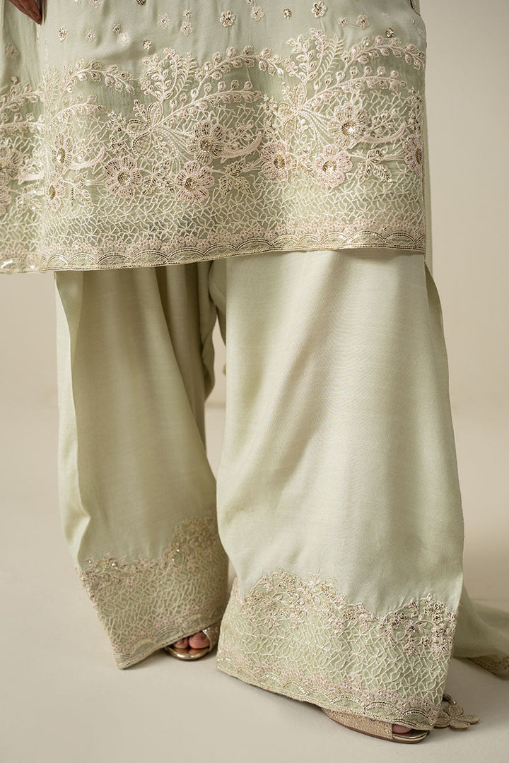 This elegant 3-piece ensemble features a minty pale a-line short shirt adorned with intricate embroidery on the back, neckline, and fitted sleeves, highlighted by delicate tasseling. Complementing the shirt is a silk dyed, embroidered flared shalwar that combines comfort with sophistication. The chiffon dupatta completes the set with matching embroidery and tasseling detail, creating a harmonious and refined look suitable for special occasions.