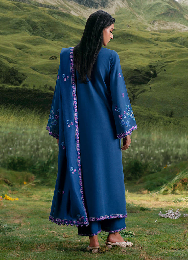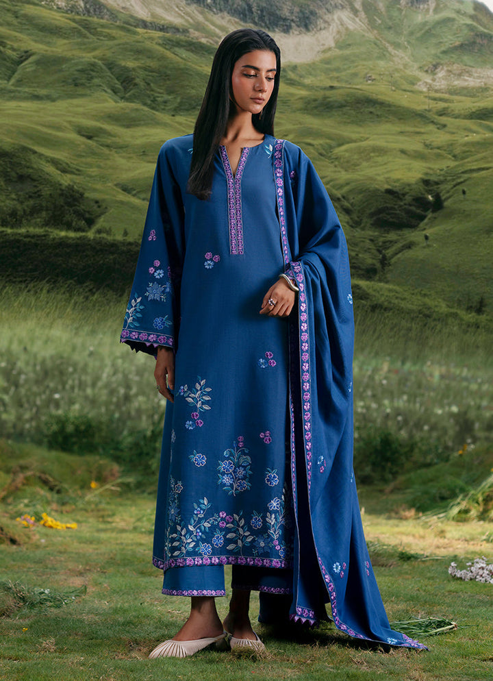 Nava in Blue from our Winterkari '25 Collection. An embroidered khaddar 3pc unstitched outfit paired with khaddar trousers & an acrylic shawl.