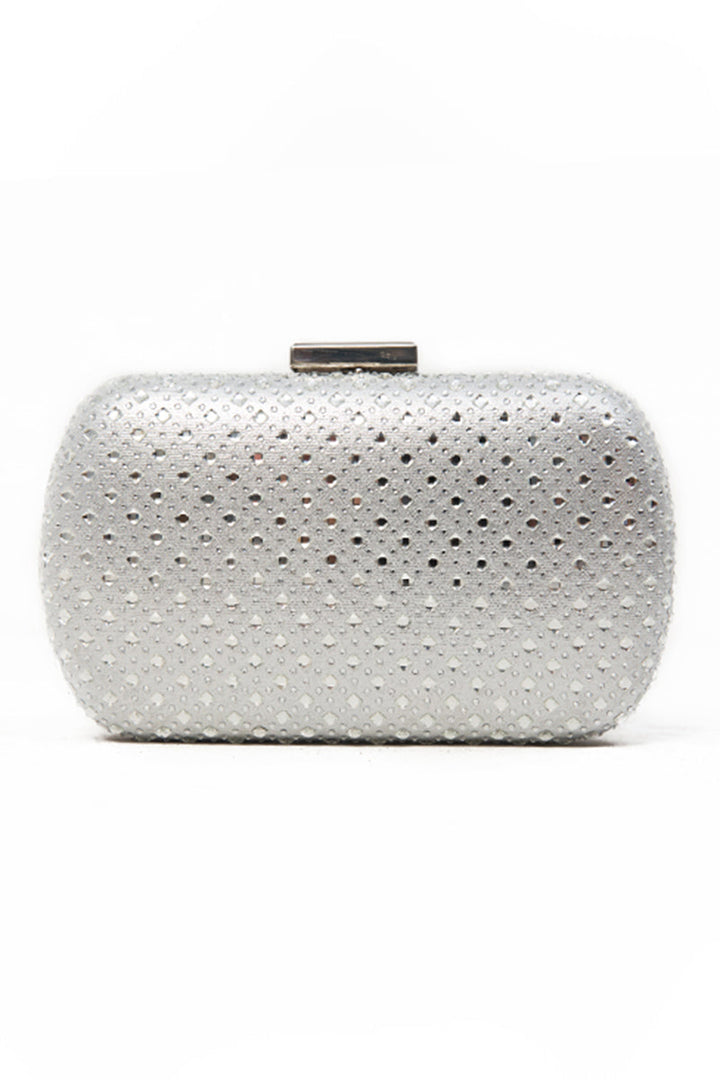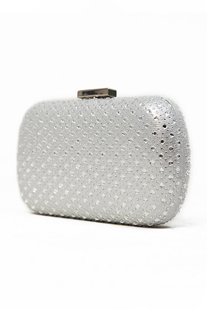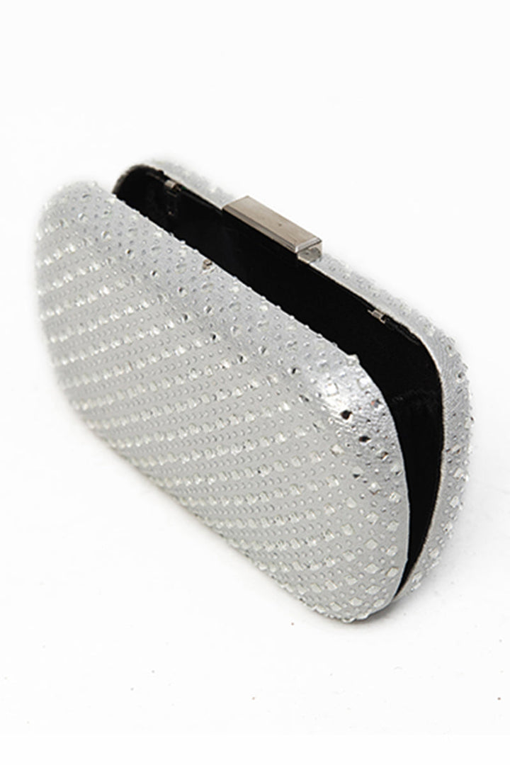Embellished clutch bag is adorned with layers of crystals and is also topped with a metal clasp