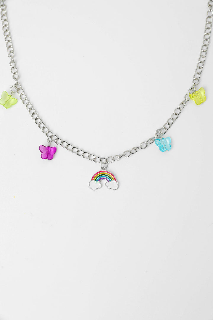 A mesmerizing necklace with chain string is adorned with variety of adorable butterfly pendants in flamboyant hues and enhanced with a rainbow pendant in the centre. Illustrated a trendy design, let your girls look classy with these statement accessories.