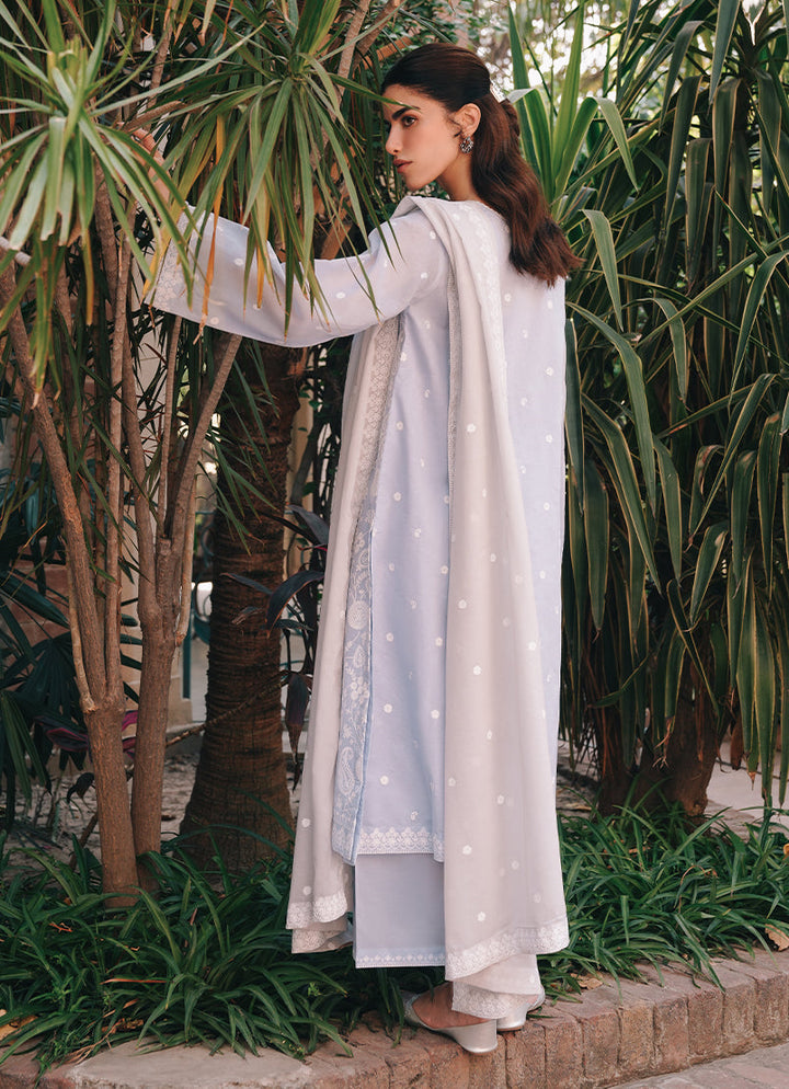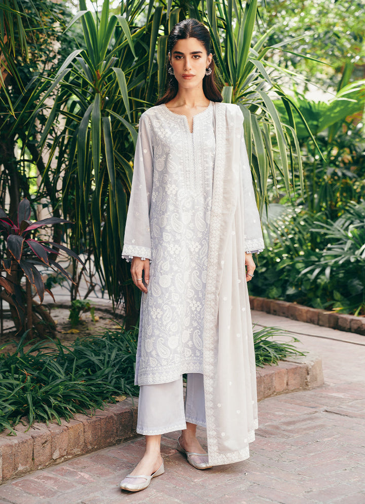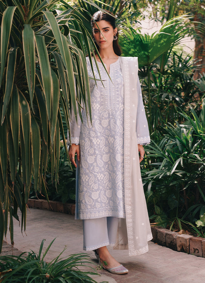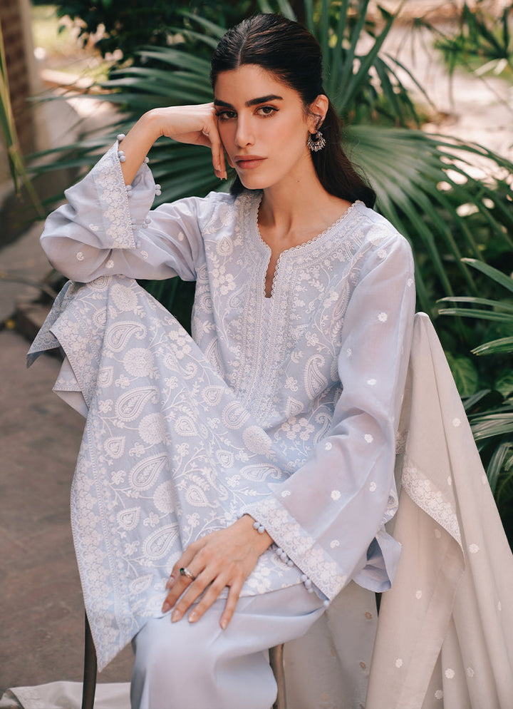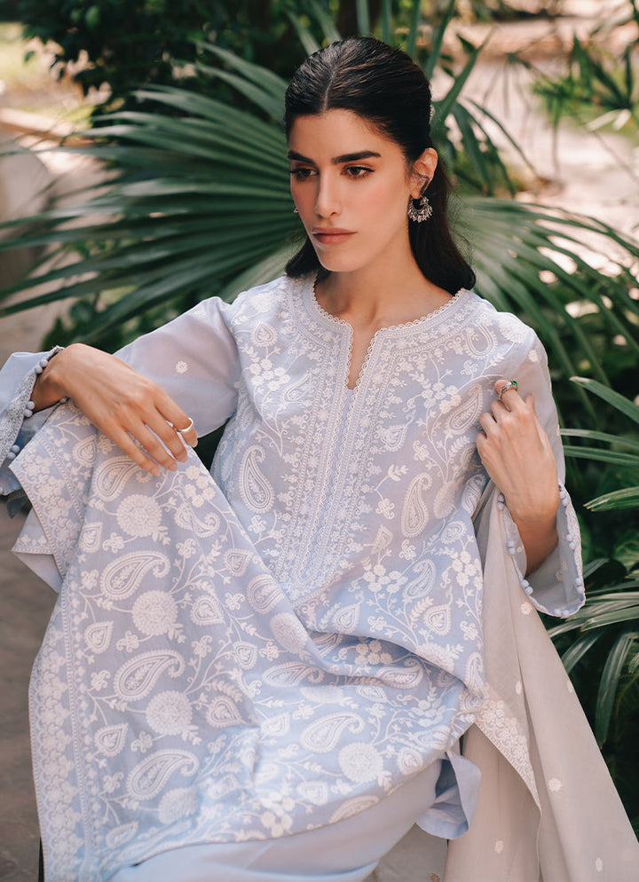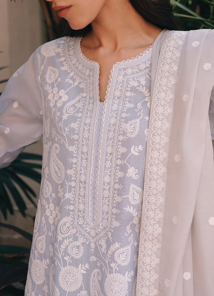 Nora in Blue/Oat Grey from our Summerkari '25 Collection. An embroidered pure cotton voile 3-piece outfit paired with embroidered trousers & dupatta.