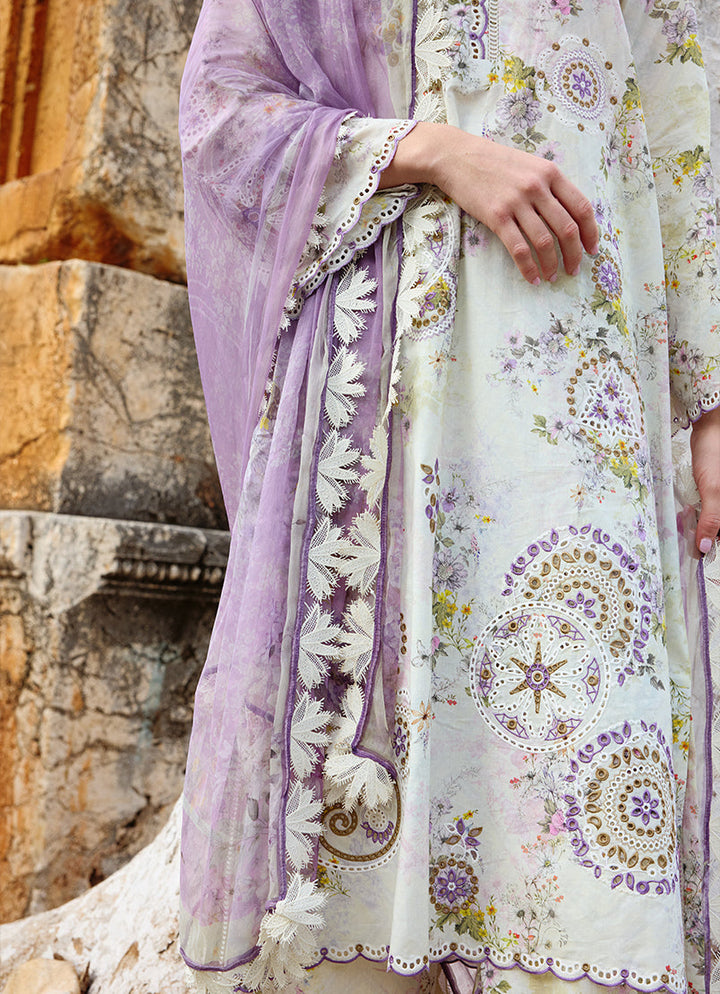 Nuray in Ivory Lavender from our Spring Printkari '25 Collection. A printed cutwork embroidered cotton 3-piece outfit paired with digital printed chiffon dupatta.