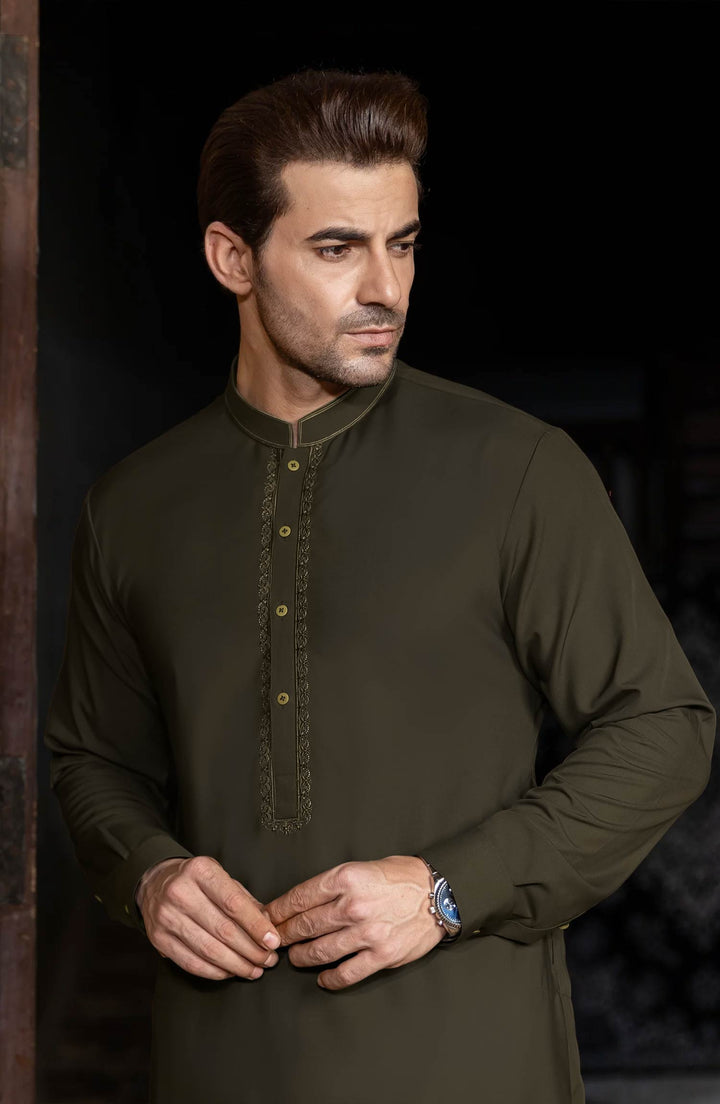 OLIVE BLENDED EMBROIDERED KAMEEZ SHALWAR