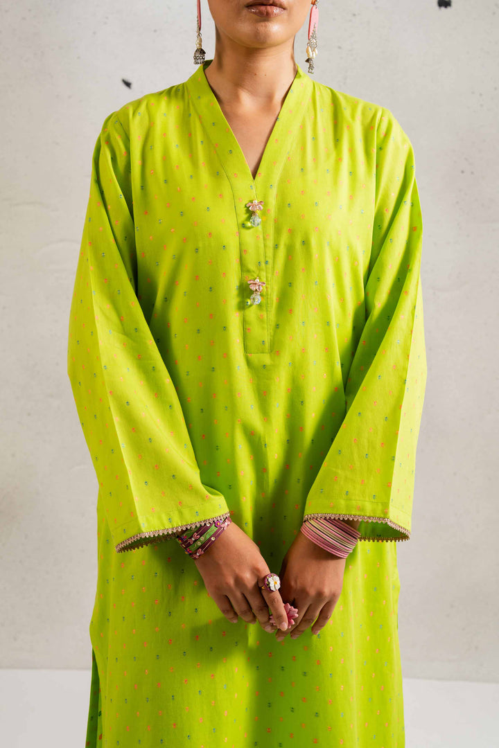 High V Neckline With Embellishment On Placket, Lace Detail At Sleeves Edges & Hem, Straight Shirt