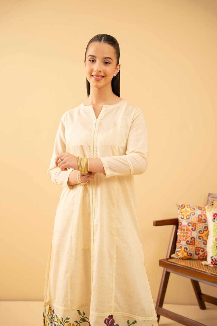 Long Paneled Shirt Featuring a Round Neckline with V-Slit and Elegant Lace Detailing on the Front.
