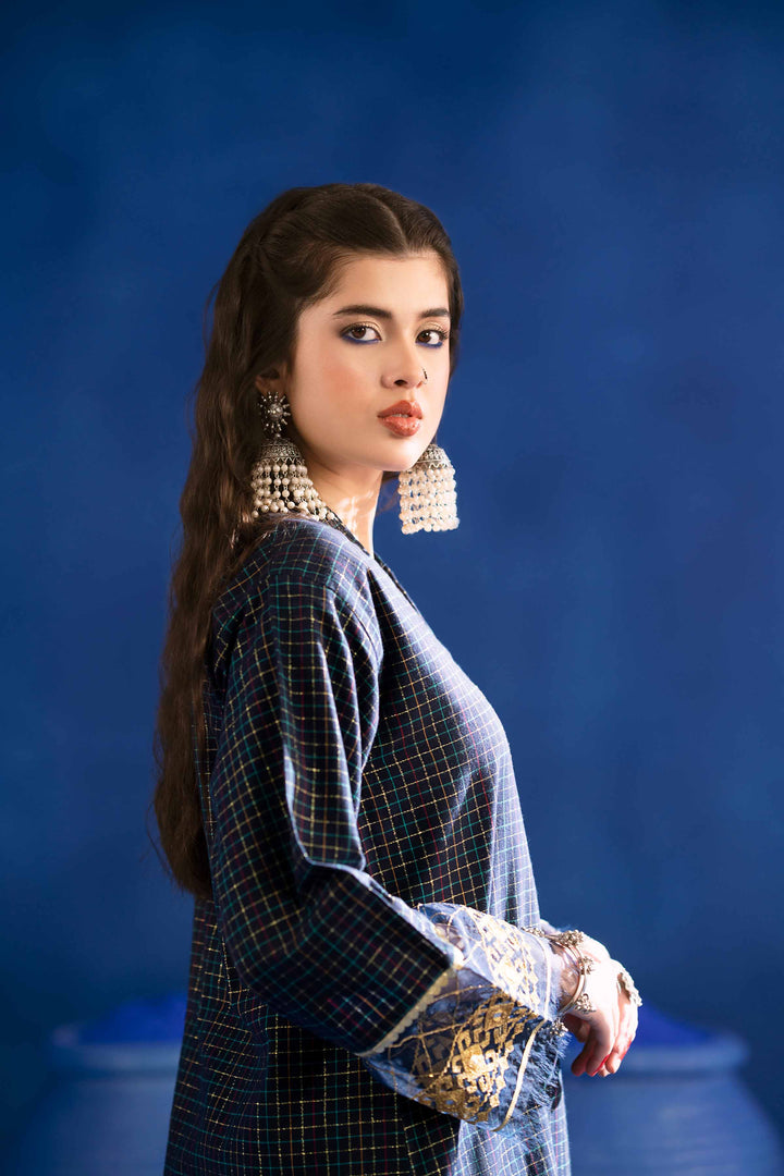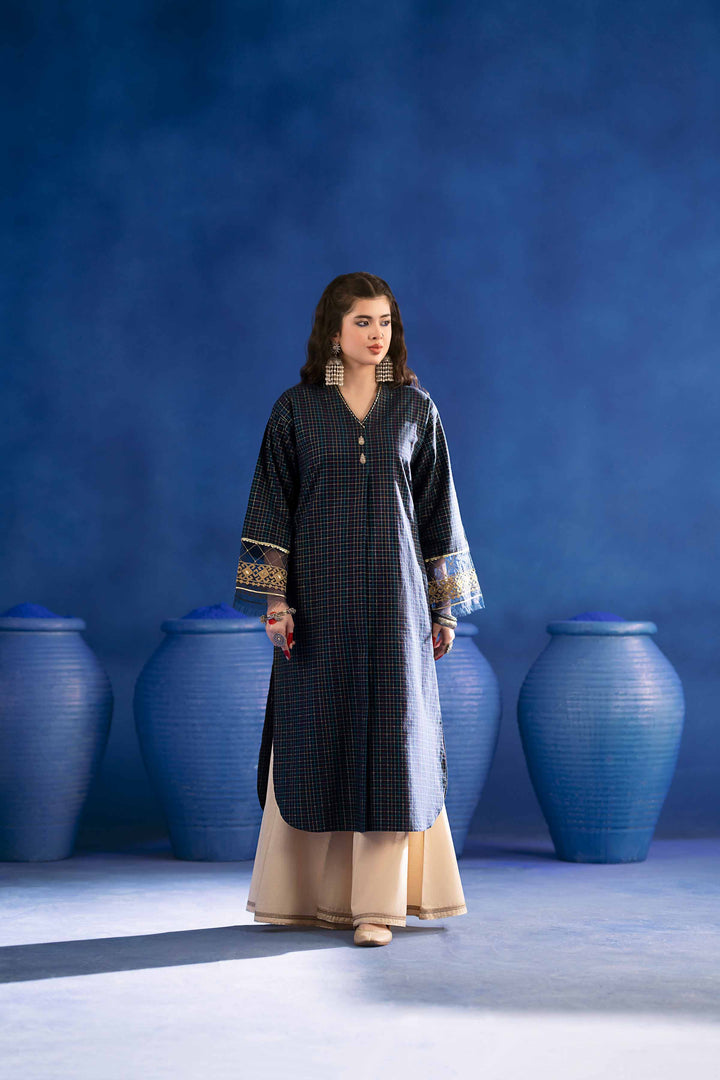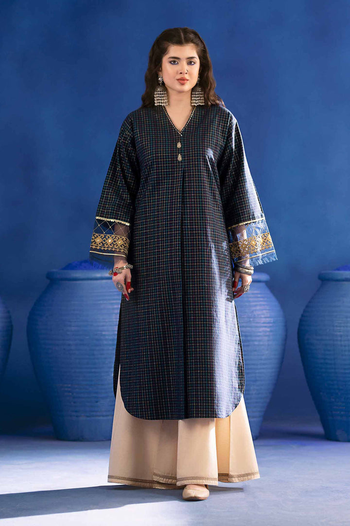 V Neckline, Embroidered Sleeves Edges, Front Pleated Long Shirt