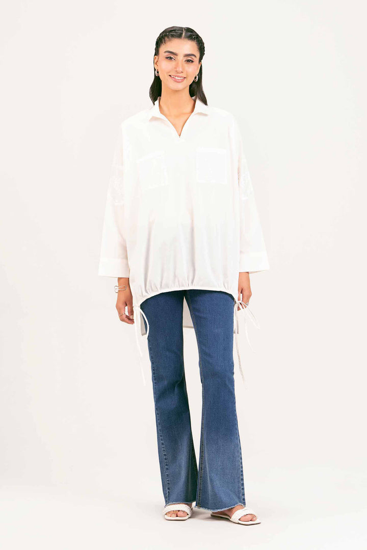 Collar Neckline, Front Pockets Detail, Embroidered Sleeves, Draw String At Hem, Short Tunic