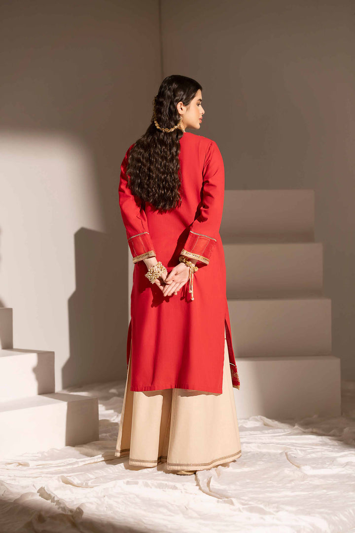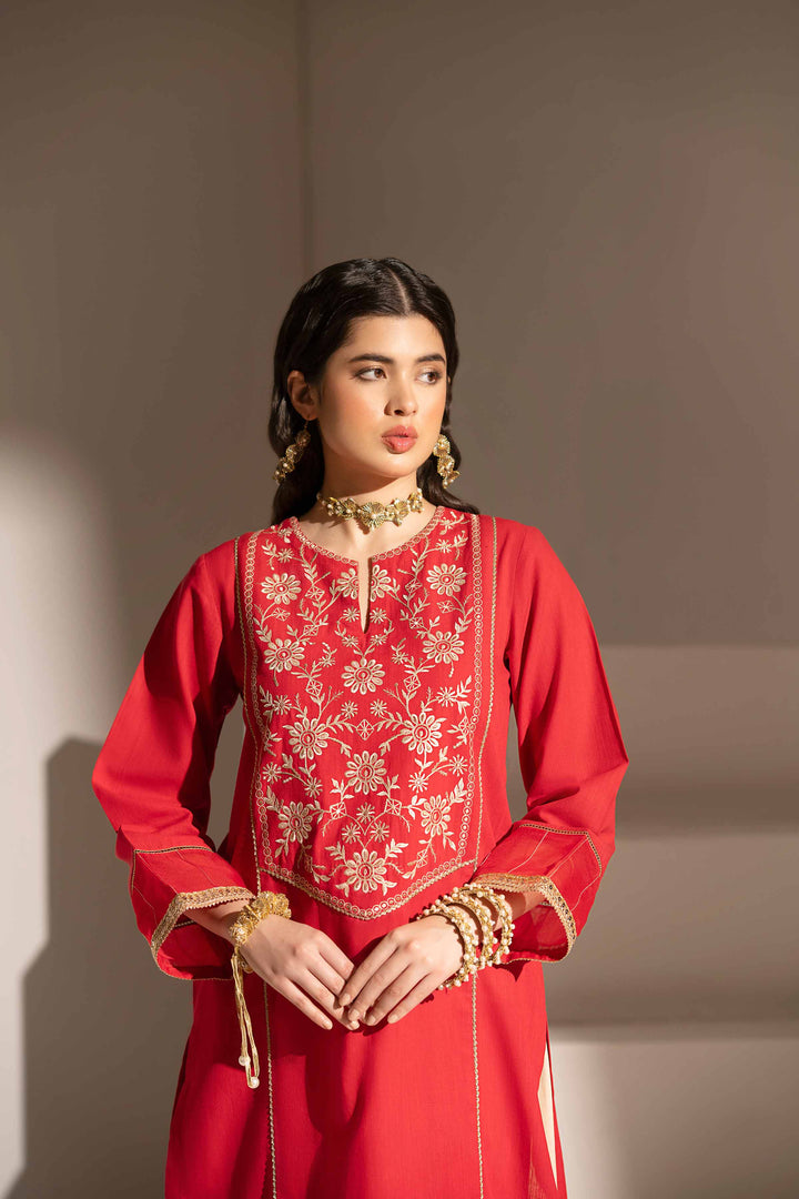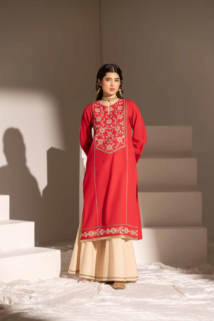 Classic embroidered shirt featuring a round neckline with slit and intricate tilla lace detailing.