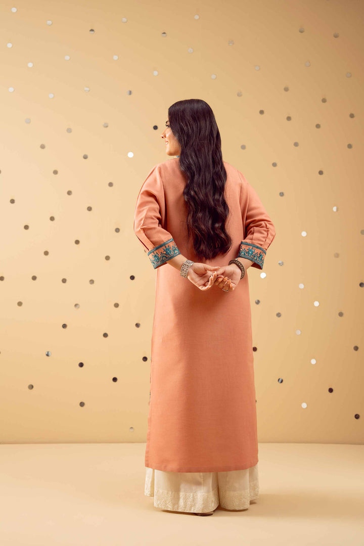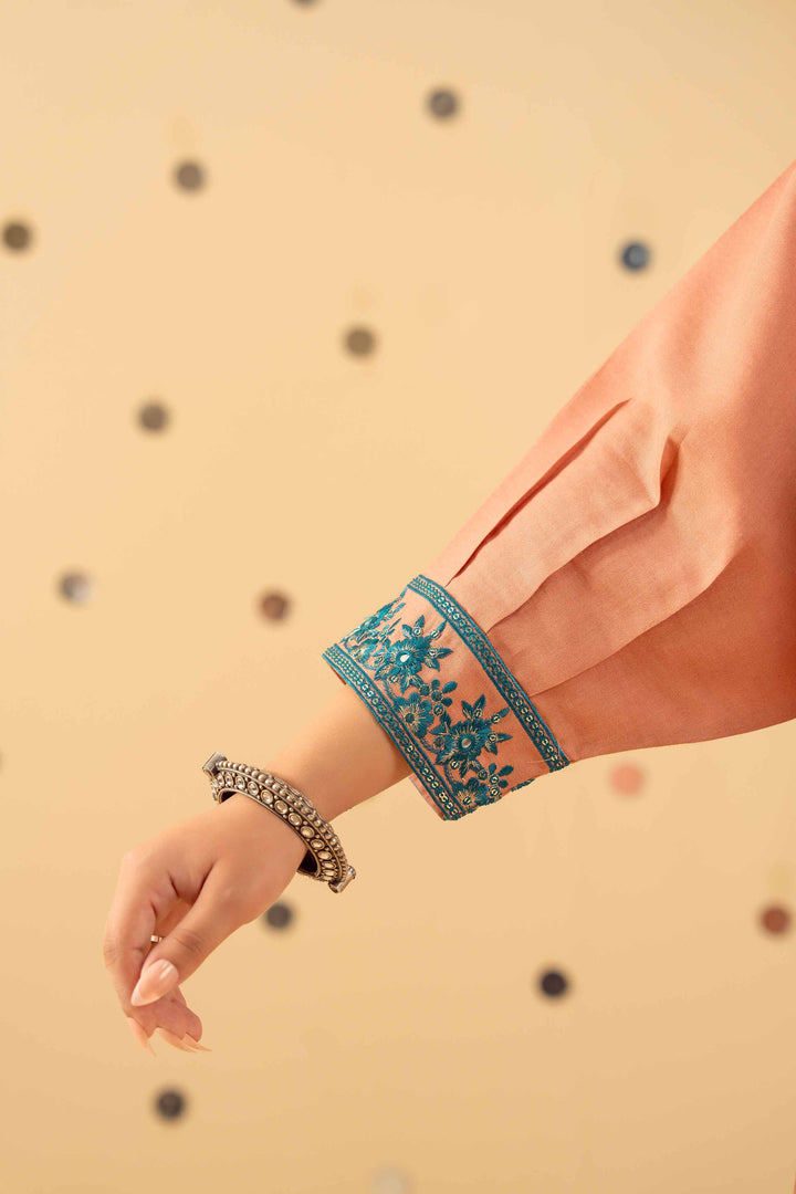 Embroidered Long Shirt Featuring a Round Band Neckline with Slit and Kimono-Style Pleated Sleeves.
