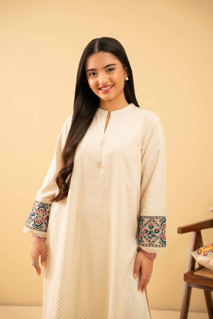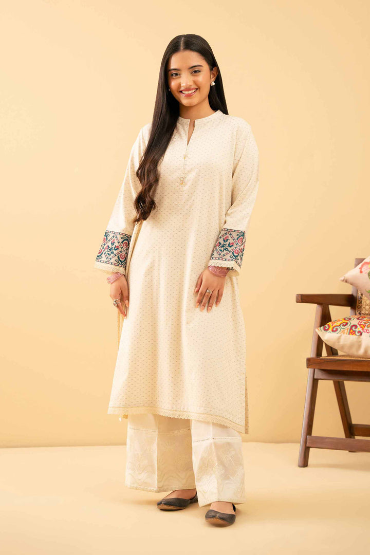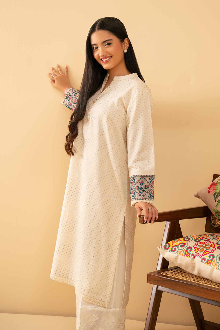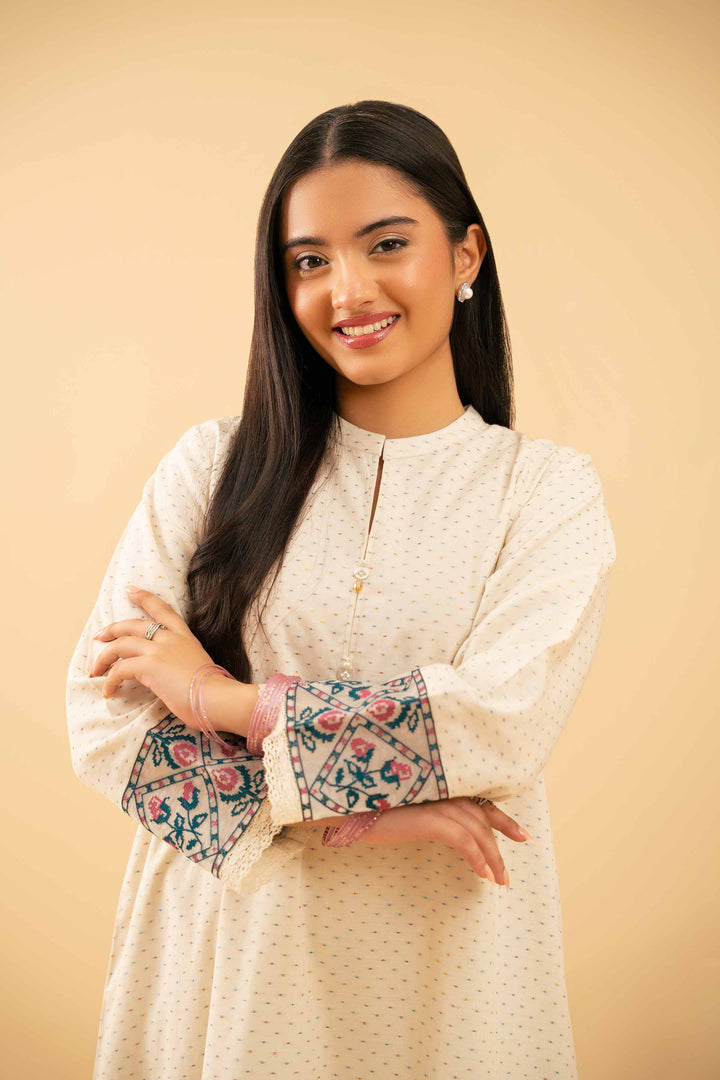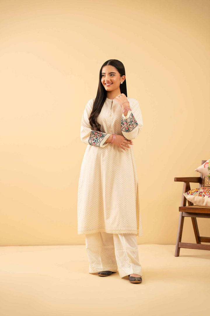 Straight shirt featuring a band neckline with a slit and adda detailing, embroidered borders on the sleeve edges, and lace insertion on the sleeves and hem.